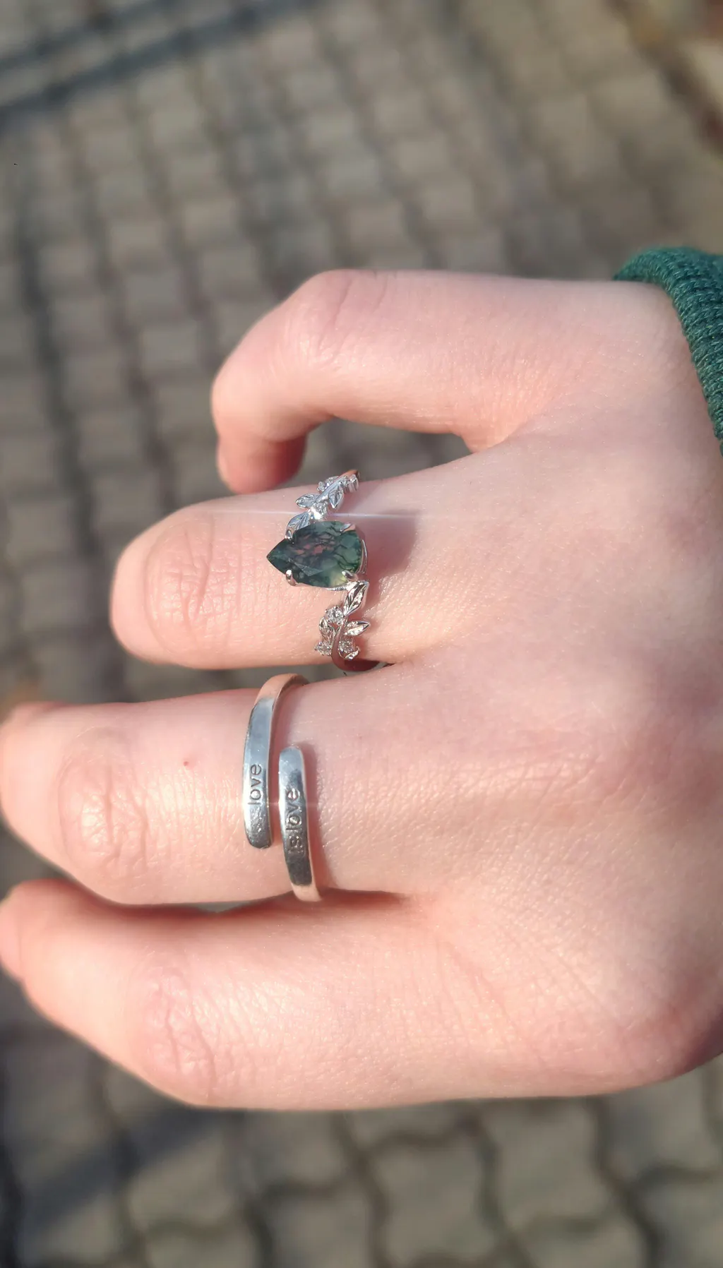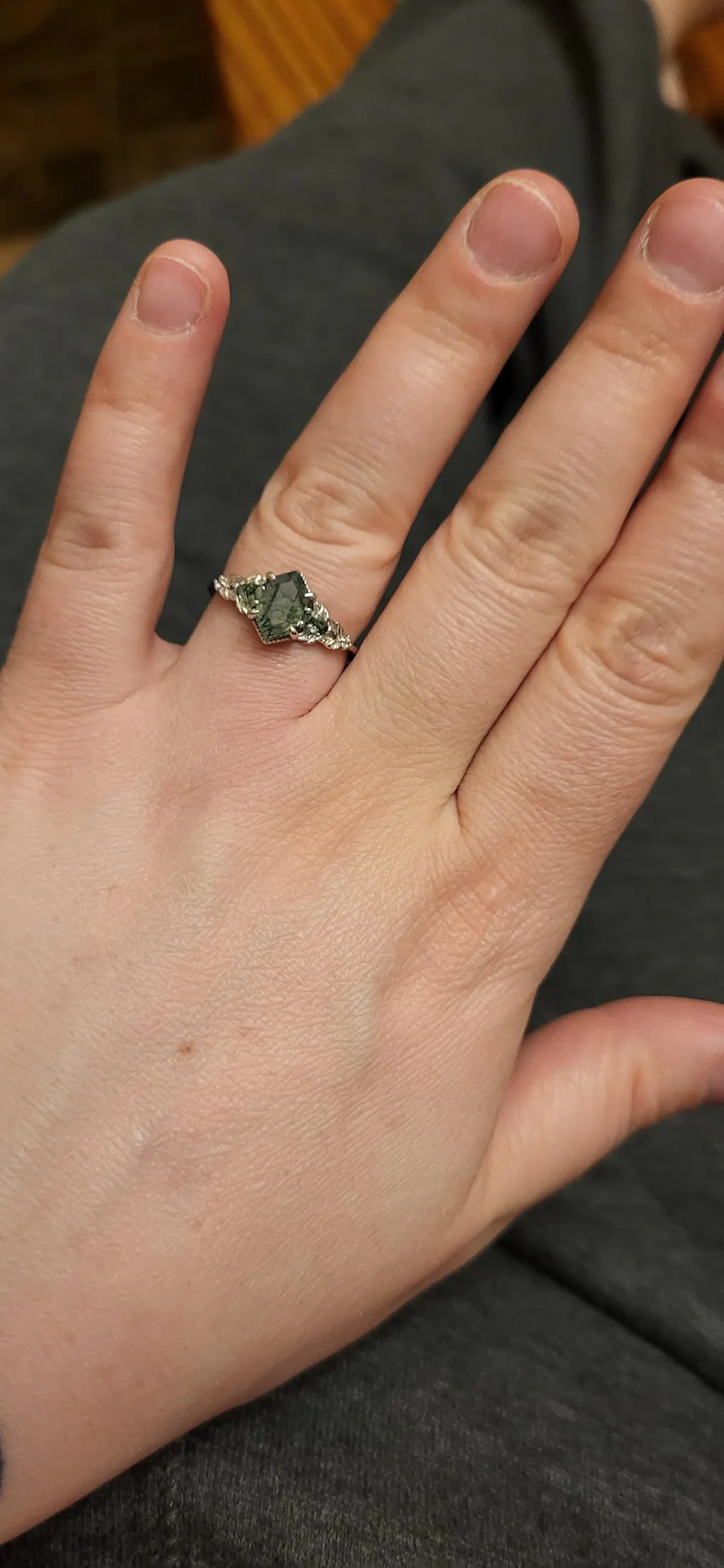 I love my ring!!! My fiancé and I picked this out as an engagement ring and it's perfect. It suits me so well, and I adore the moss agate so much. The quality of the design and setting is just divine. It's elegant, dainty and gorgeous. I love this cut of gem, it feels unique and well balanced. I am in love.