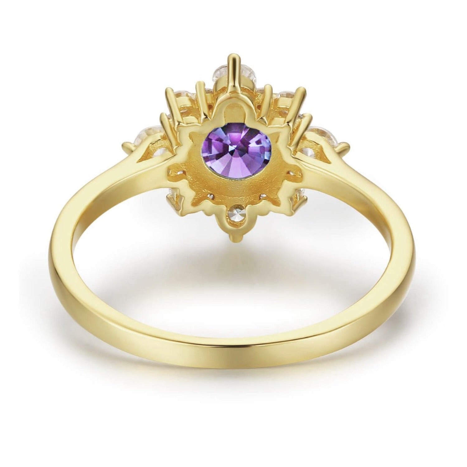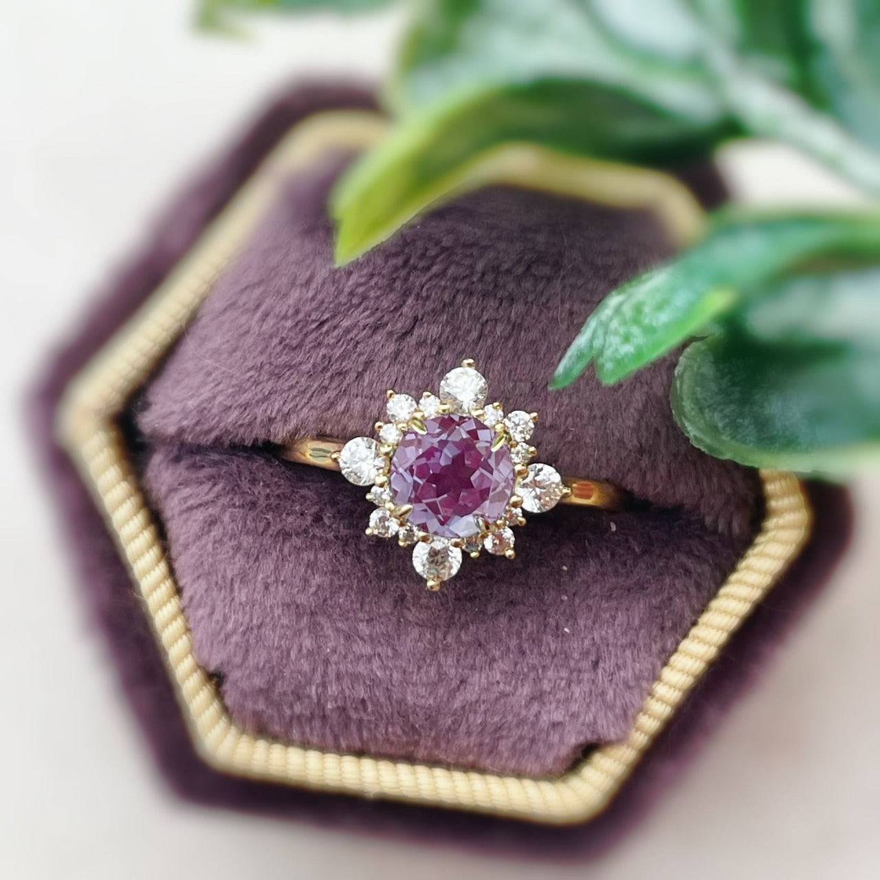 The Desert Blossom Alexandrite Ring captures the quiet strength of a flower that blooms in silence and the magic of a gemstone that changes with the light. At its center is a round alexandrite, known for its mesmerizing shift between deep violet and twilight blue, like the changing hues of dusk in a desert sky. It is framed by a halo of sparkling diamond-like stones in a floral silhouette.