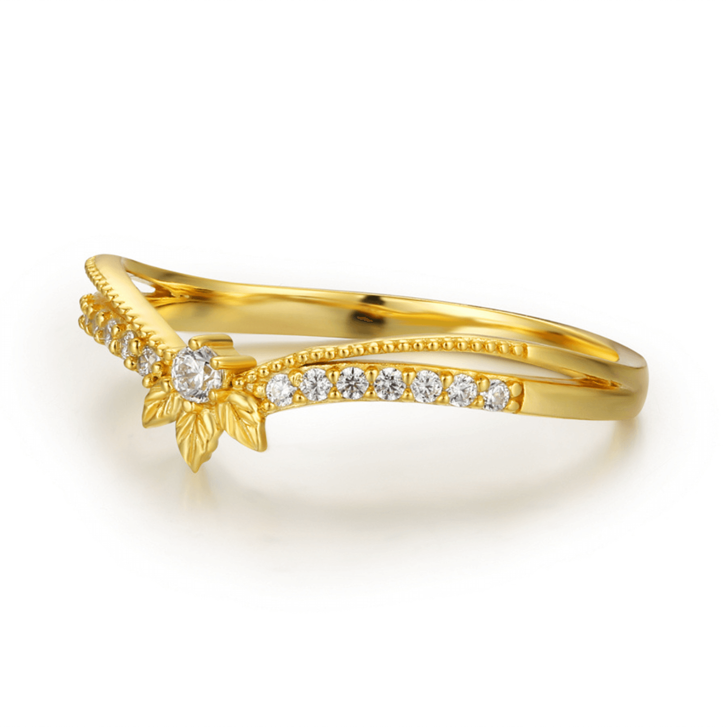 Step into the world of enchanted elegance with the nature-inspired stacking ring designed for those drawn to quiet power and symbolic beauty. This leafy stacking ring features a graceful split shank band adorned with delicate leaf motifs, shimmering white gem accents, and a brilliant round center stone that symbolizes clarity, purpose, and awakening.