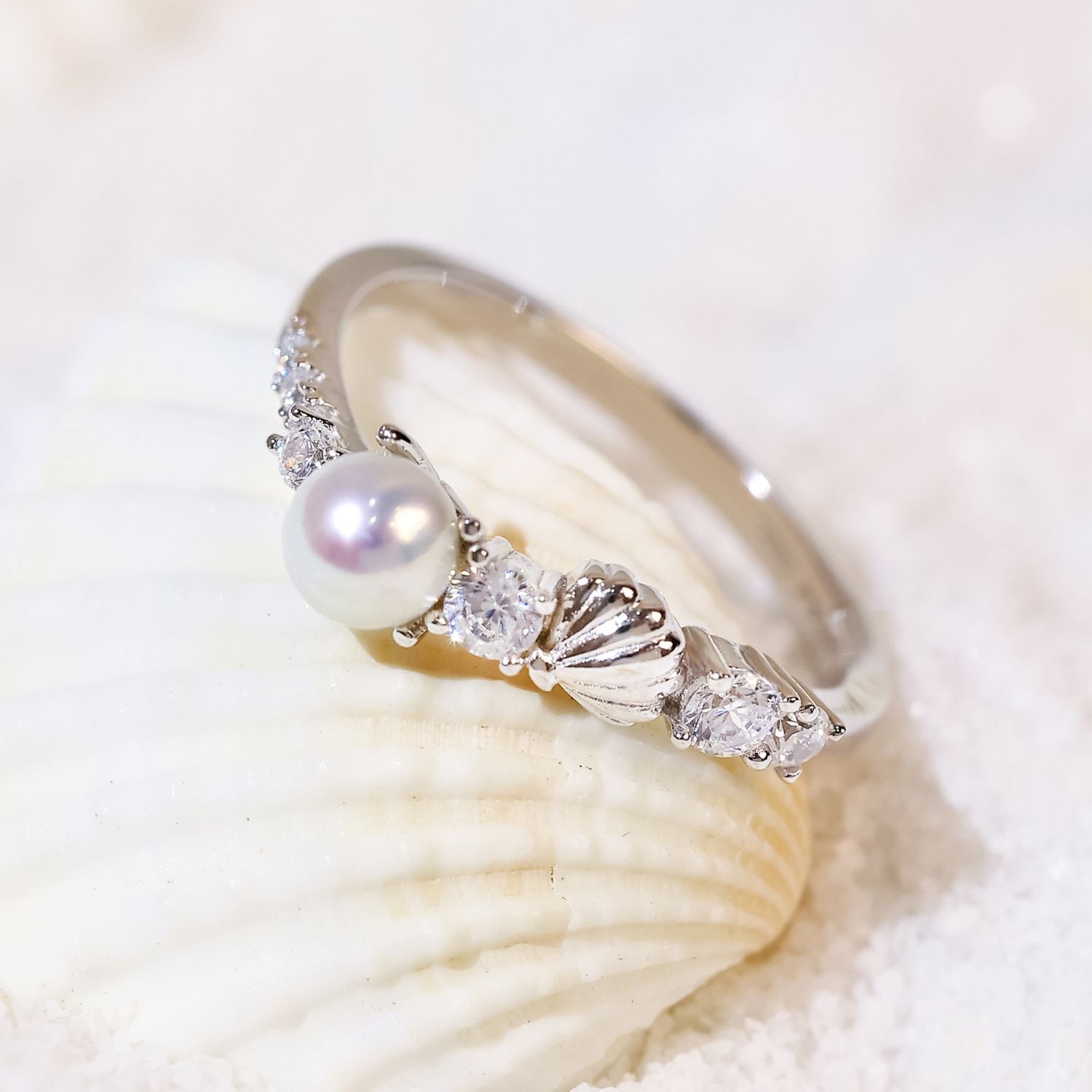 Channel the mystery of the deep with this pearl ring—an ocean-inspired ring handcrafted for mermaid hearts and ocean dreamers. This enchanting piece features a luminous natural freshwater pearl, symbolizing intuition and inner peace, set in a delicate band flanked by sparkling gems and a sculpted seashell detail that evokes ancient sea treasures.