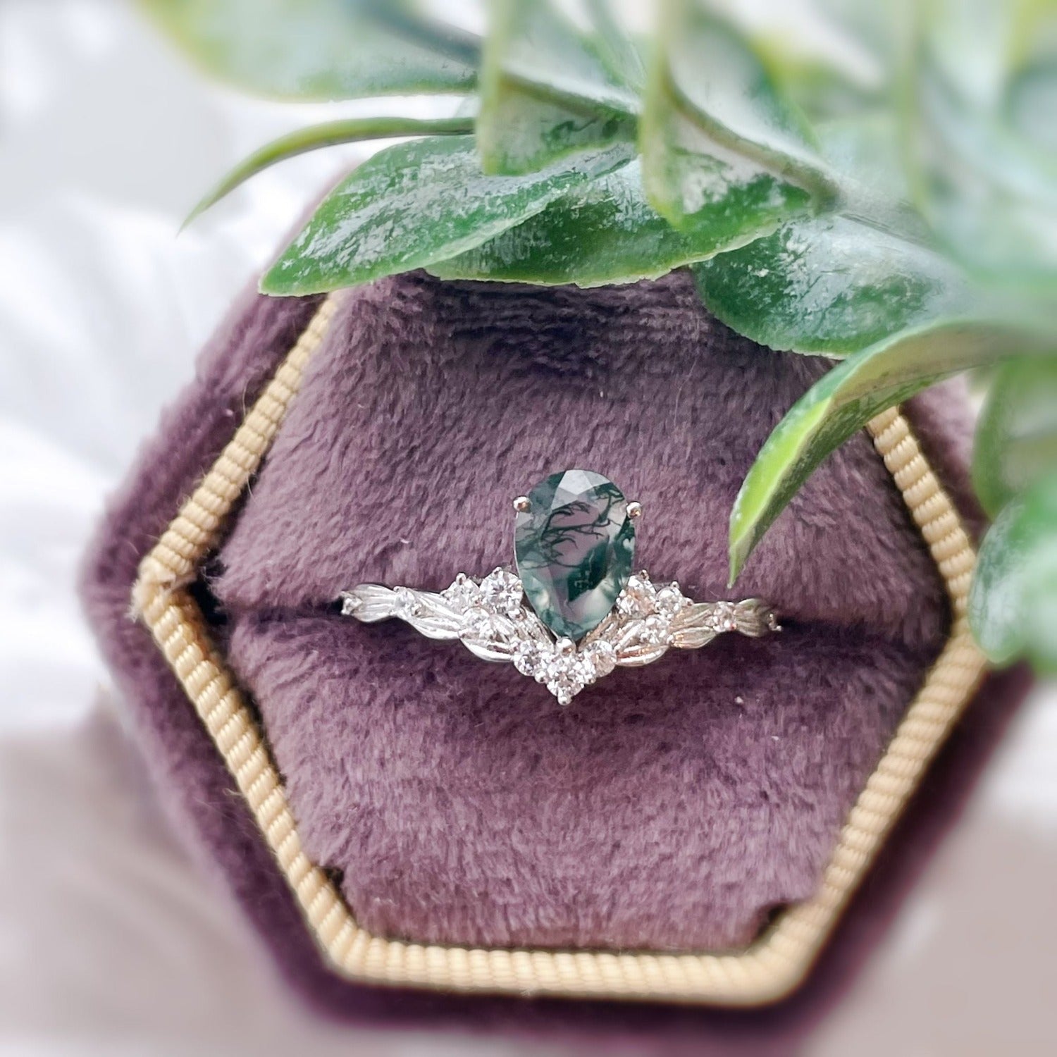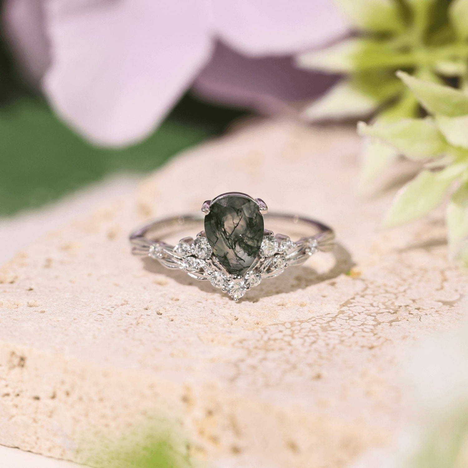 ✦ 5x7mm natural pear-cut moss agate (center stone)