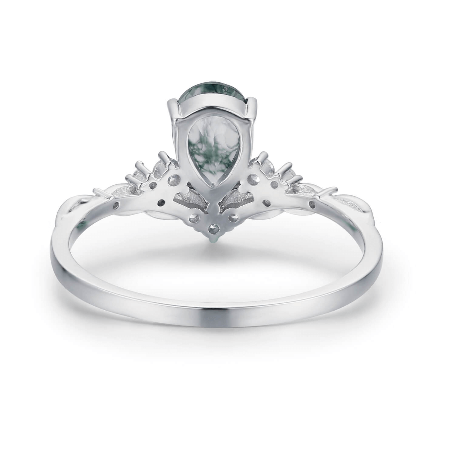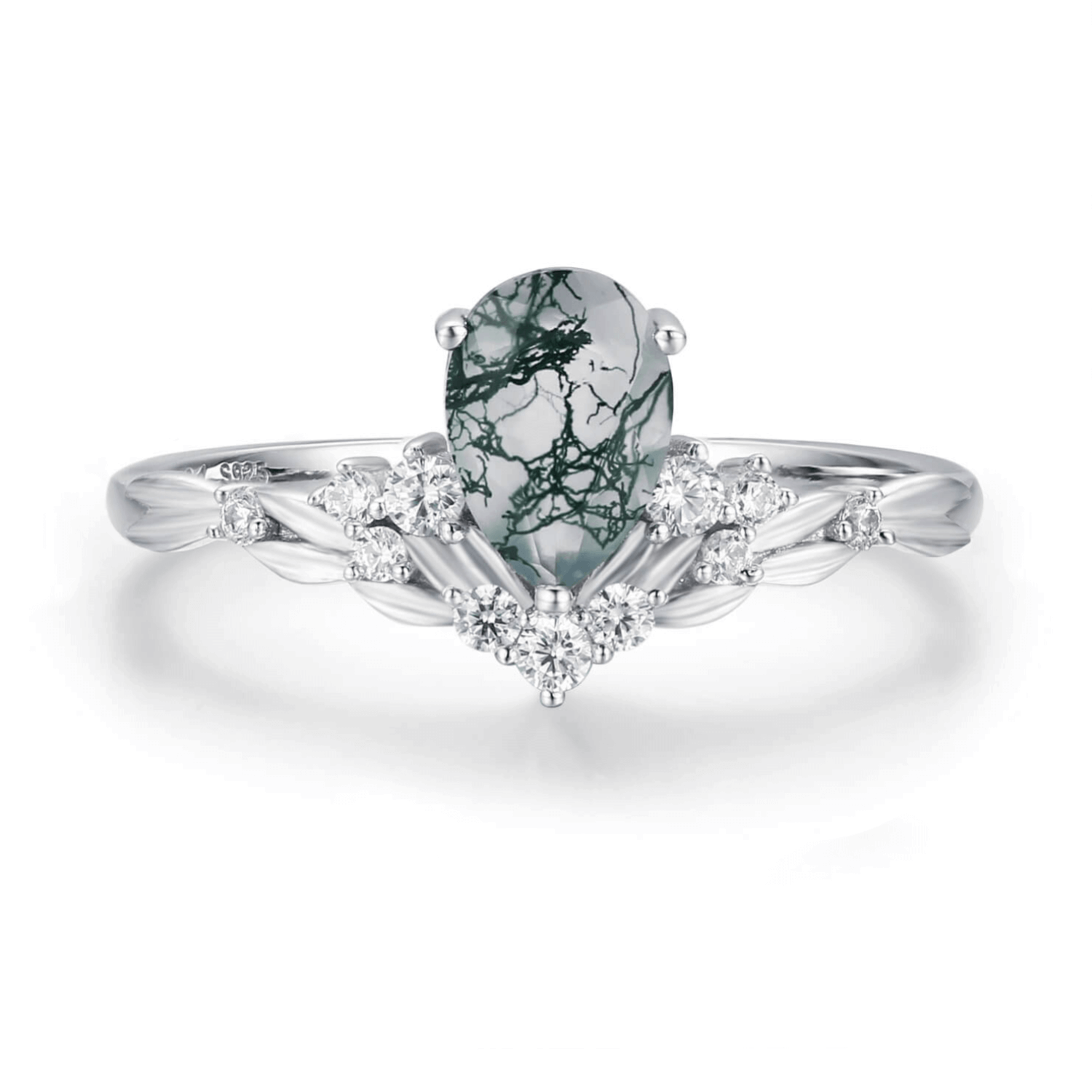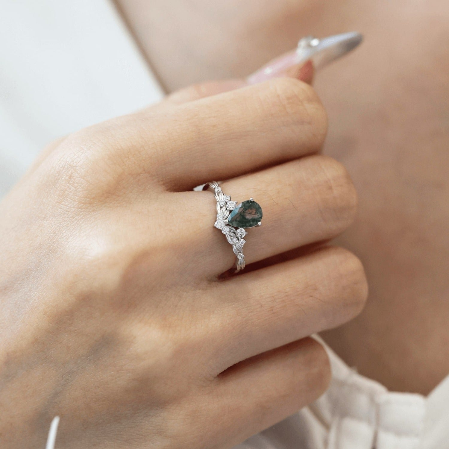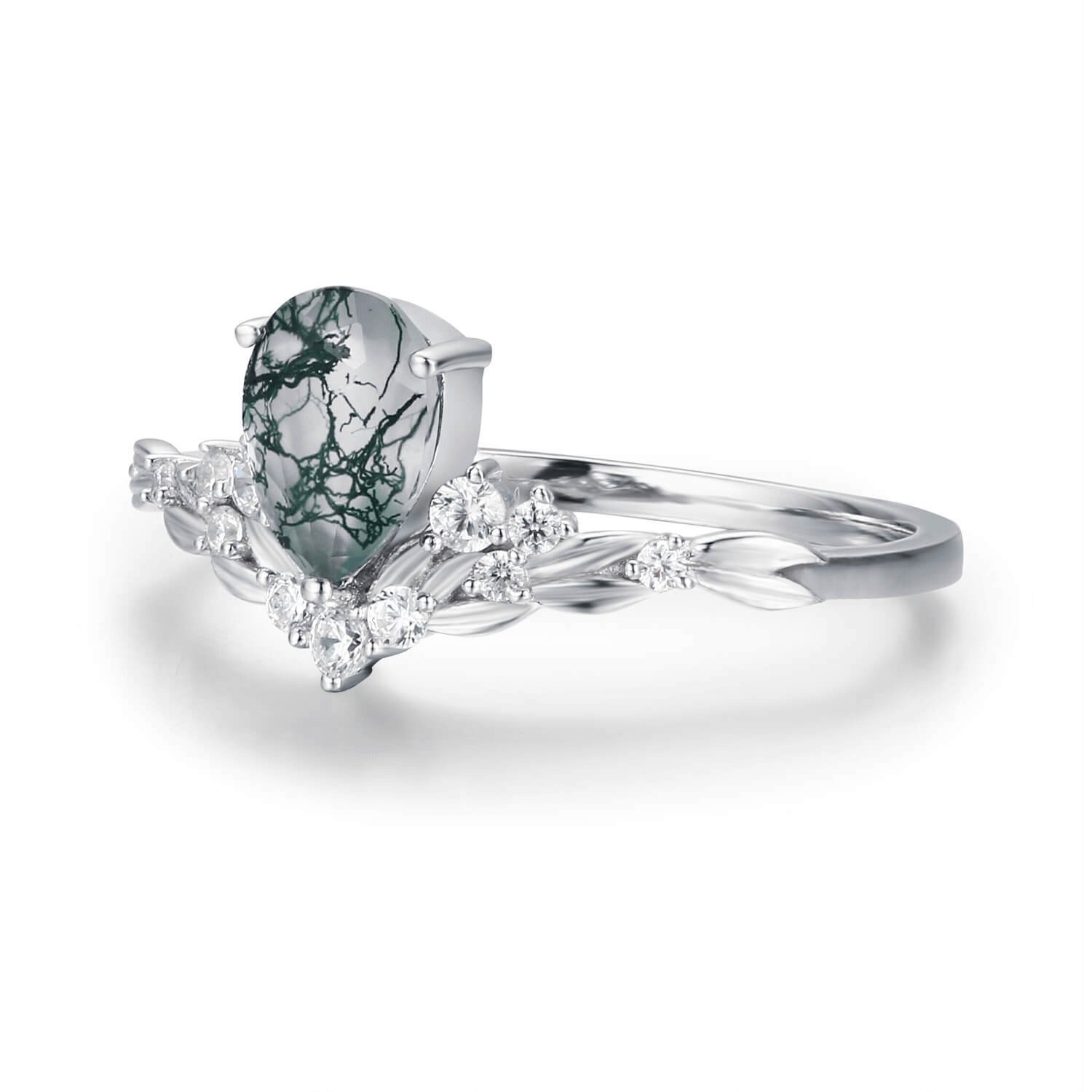 At its center rests a pear-shaped moss agate, each stone unique with green, root-like inclusions—resembling vines or moss suspended in crystal. Delicately set in a leafy band framed by shimmering white accents that bloom upward like petals kissed by morning light.