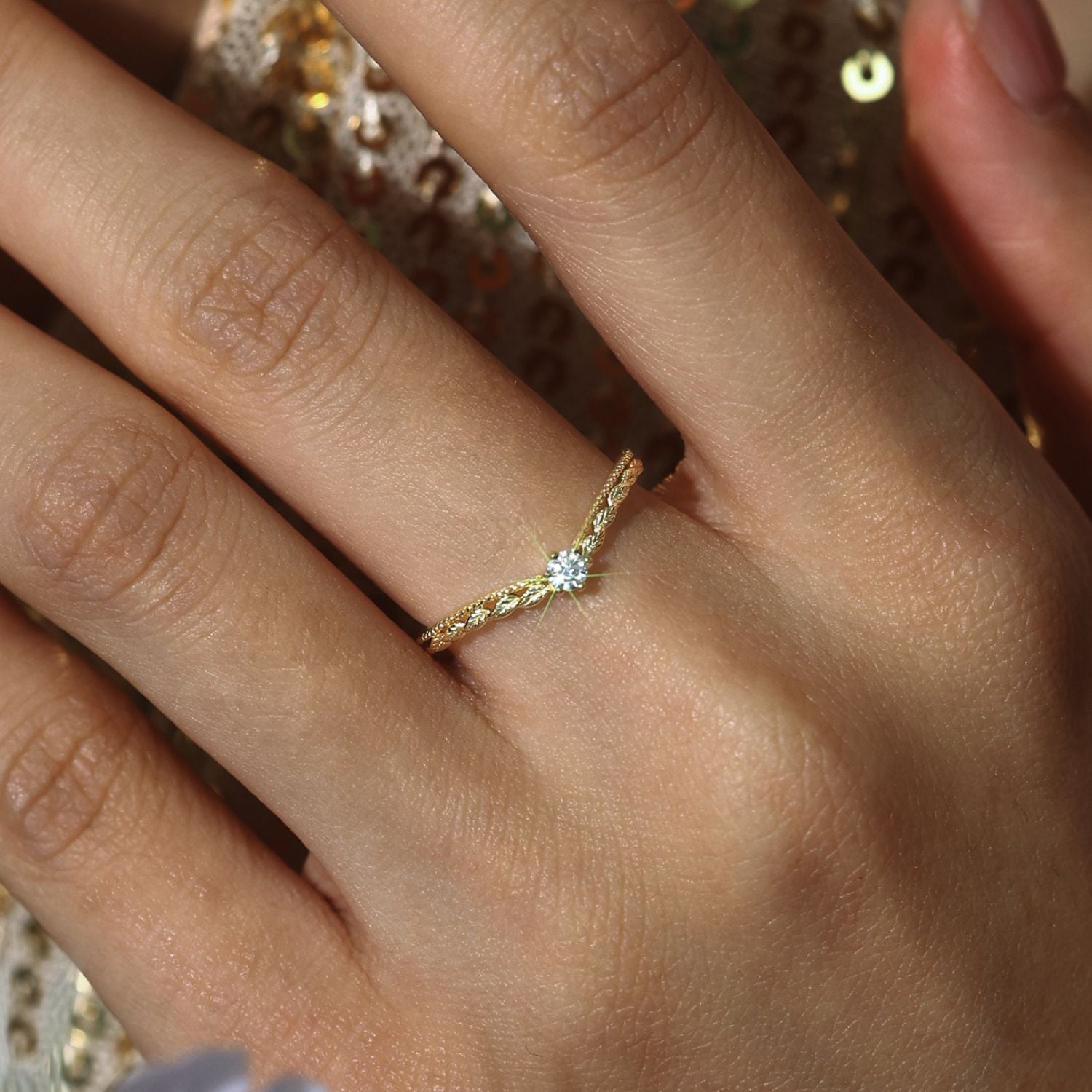 Add a touch of nature-inspired elegance to your jewelry collection with the Avalon Stacking Band. This delicate chevron-style ring features a graceful row of engraved leaves accented by a sparkling round diamond-like stone at its peak.