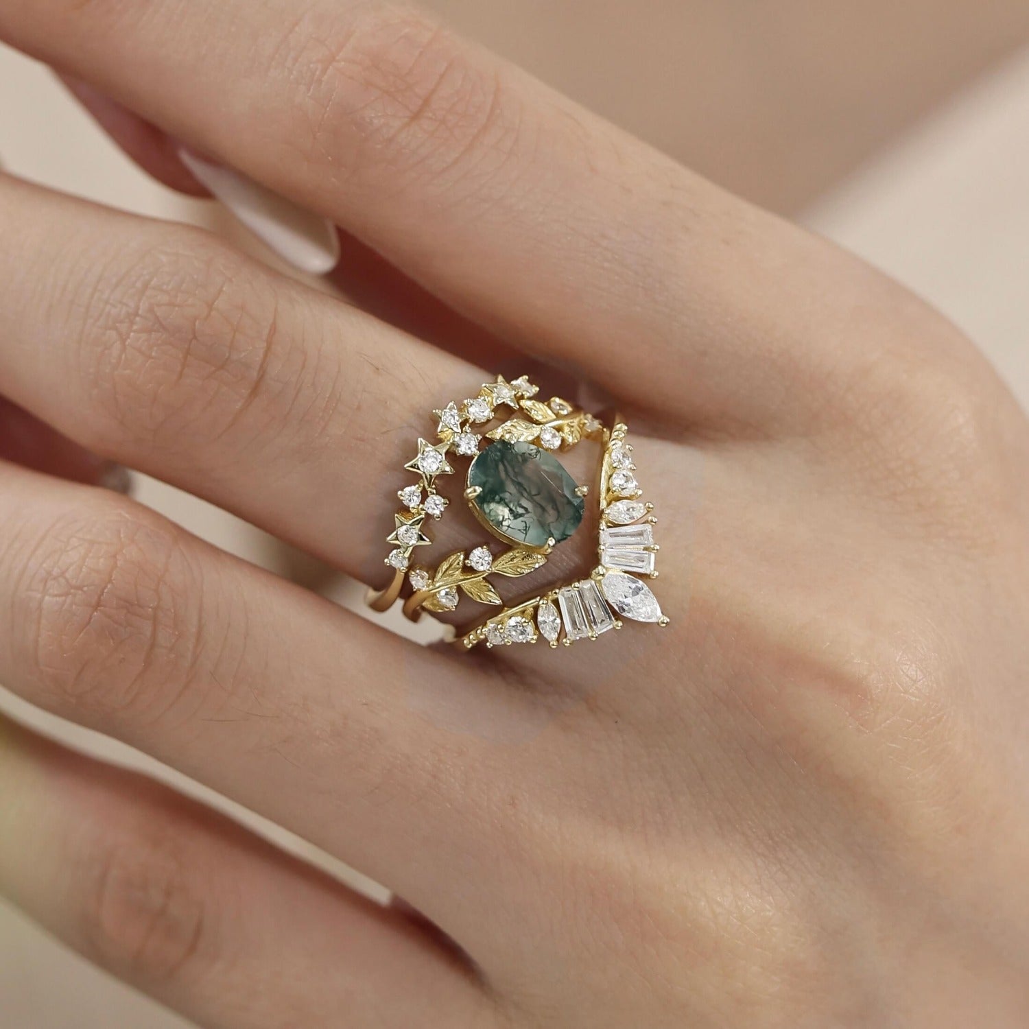 Rooted in the magic of the forest, this nature-inspired moss agate ring is a timeless symbol of growth, balance, and inner peace. This leafy ring features an oval-cut moss agate gemstone, each one uniquely patterned with green inclusions resembling delicate branches or forest mist—making every ring one of a kind.