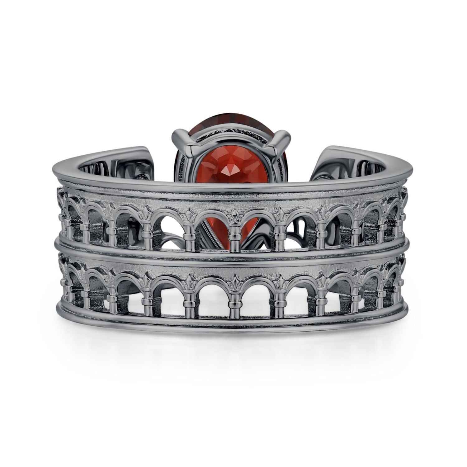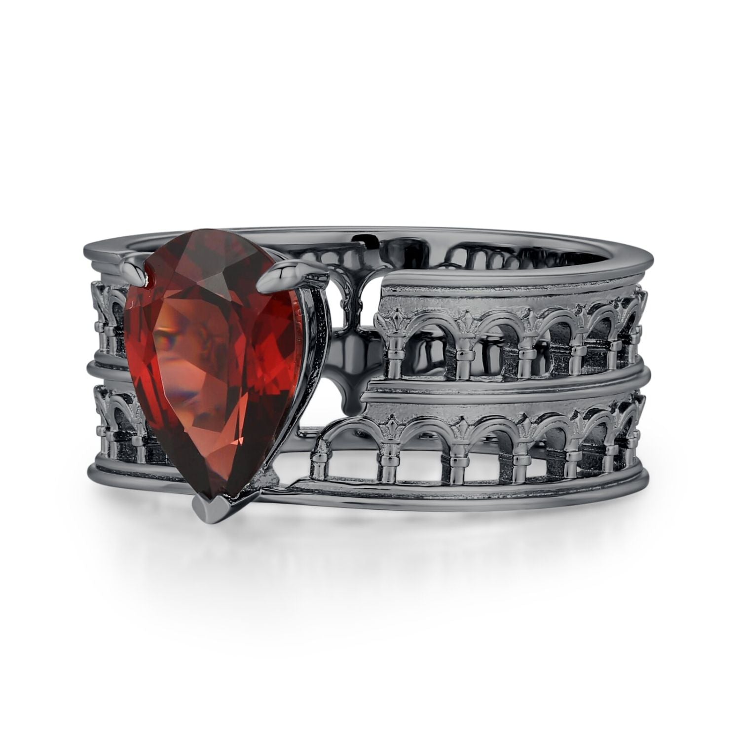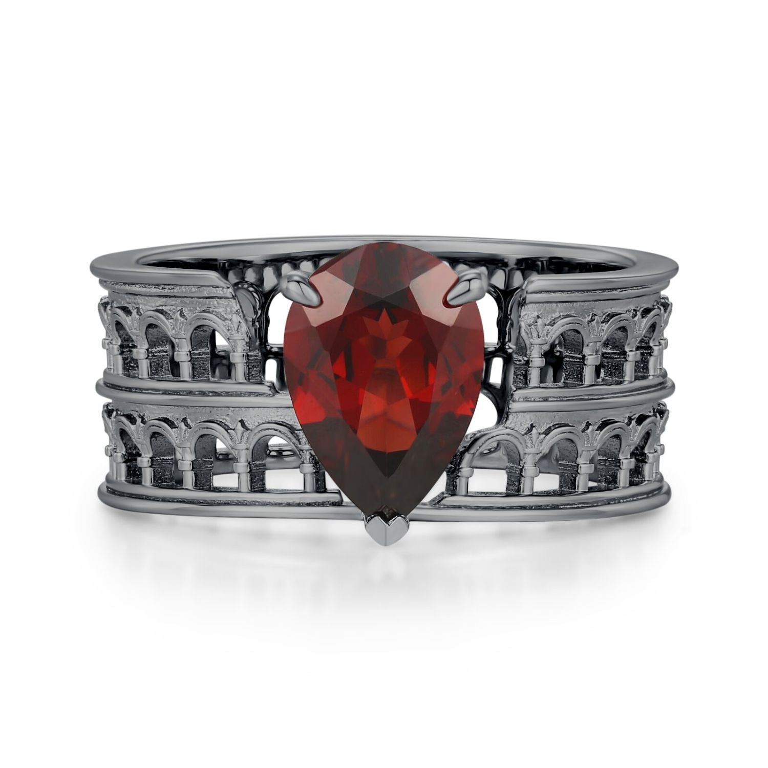 At its center sits a striking pear-cut Mozambique red garnet, its deep, blood-like hue symbolizing courage, passion, and unbreakable love. The band is crafted in a bold black gold finish, featuring intricate Colosseum-inspired arch motifs.