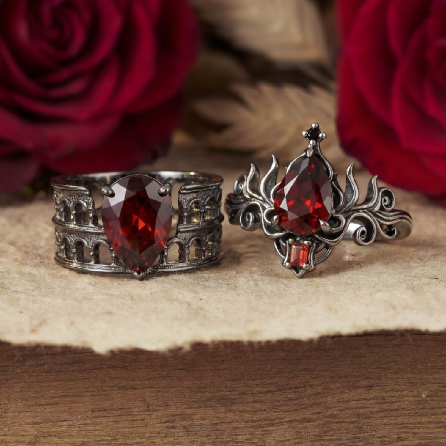 This red garnet ring is perfect as dark fantasy jewelry, a bold alternative engagement ring, or a unique gothic statement ring.