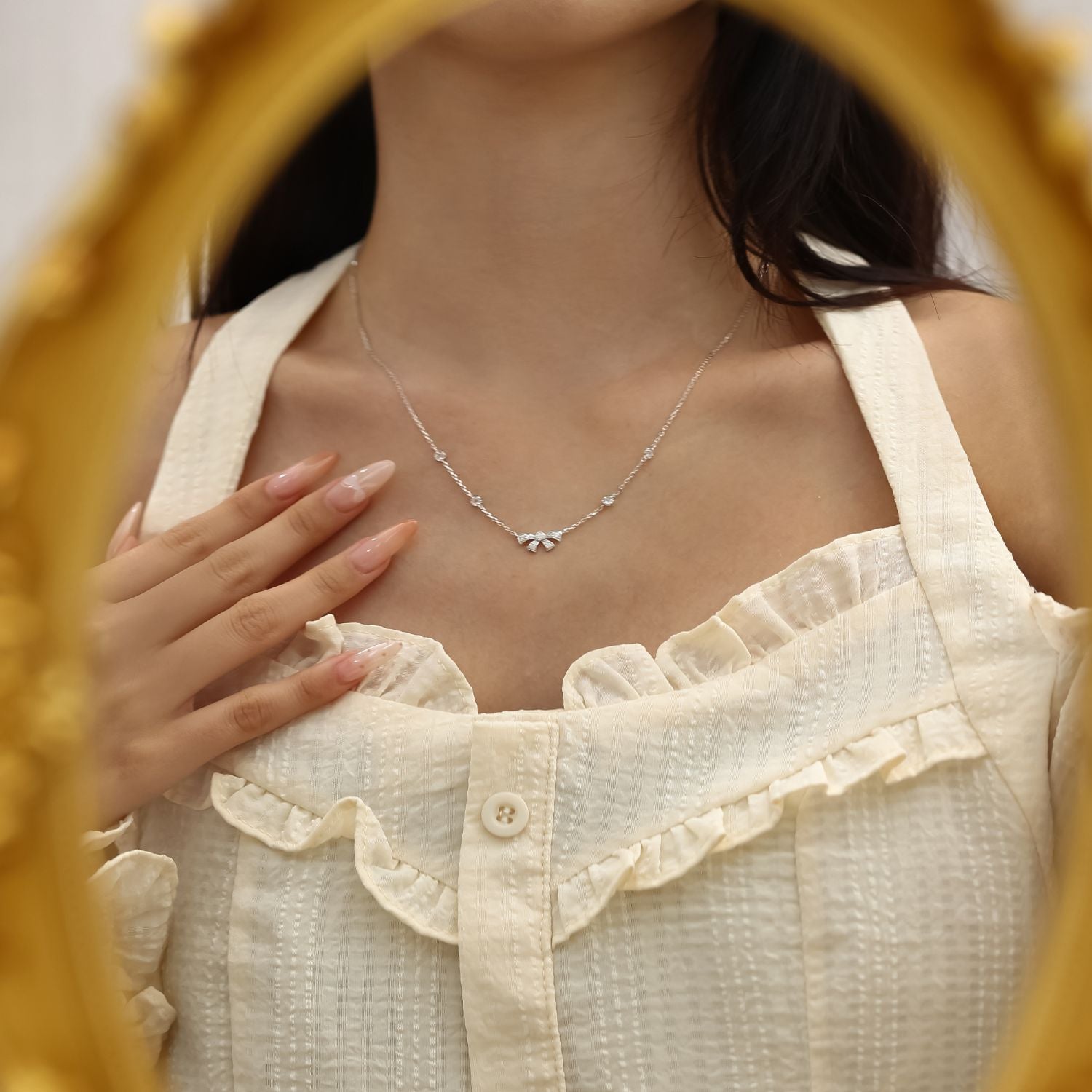 Add a touch of elegance and enchantment to your everyday look with this dainty bow necklace inspired by the beauty of nature and the charm of a delicate bow. Designed for the modern romantic, this delicate pendant necklace features a graceful bow centerpiece adorned with white topaz stones, catching the light with every movement.