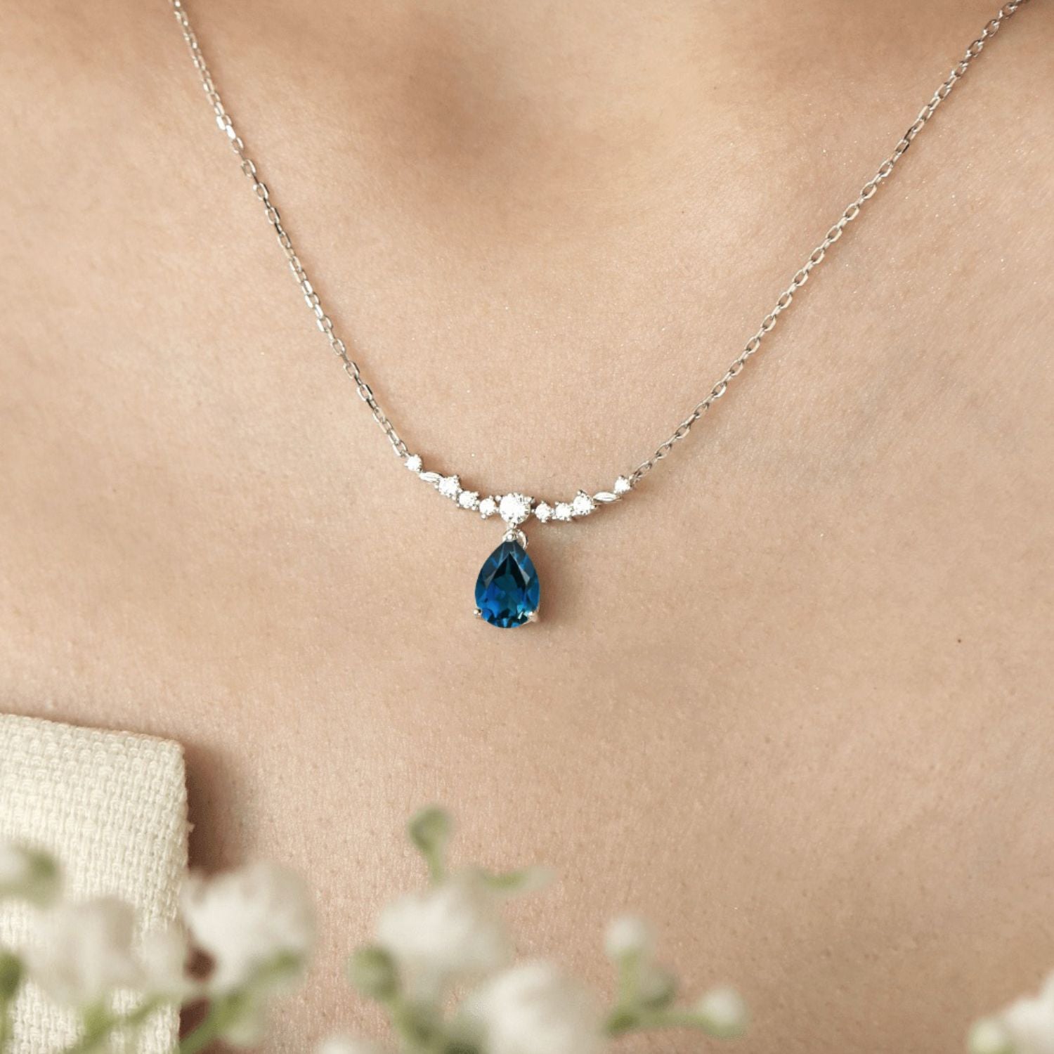Like the calm depths of a twilight sea, the Breezy Whisper London Blue Topaz Necklace captures the serene beauty of nature’s most enchanting moments. The pear-cut London blue topaz gemstone shimmers with deep, mysterious hues, reflecting the whispers of the evening breeze and the magic of hidden dreams.