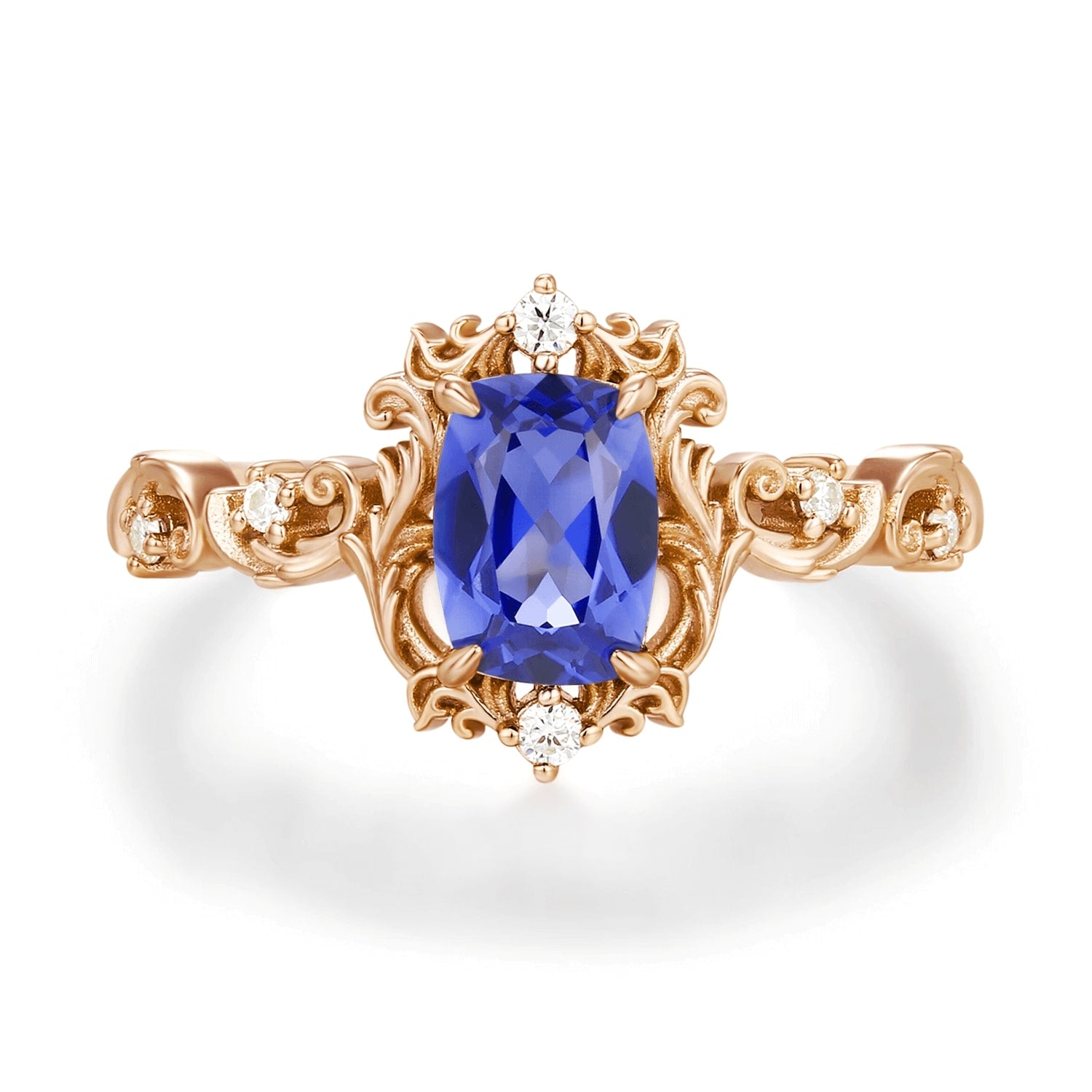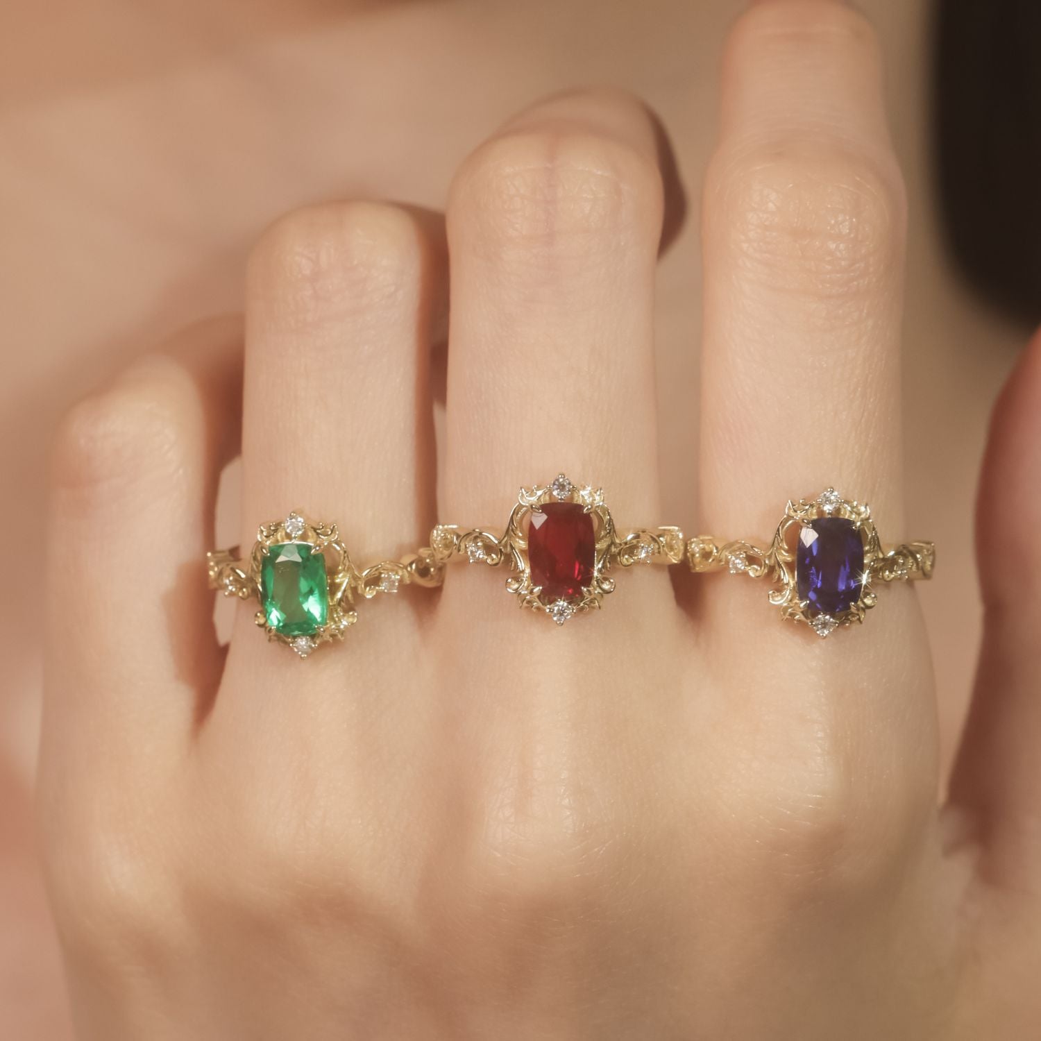 ✦ Customizable 5x7mm cushion-cut center stone (lab-grown royal blue sapphire, lab-grown emerald, or lab-grown ruby)