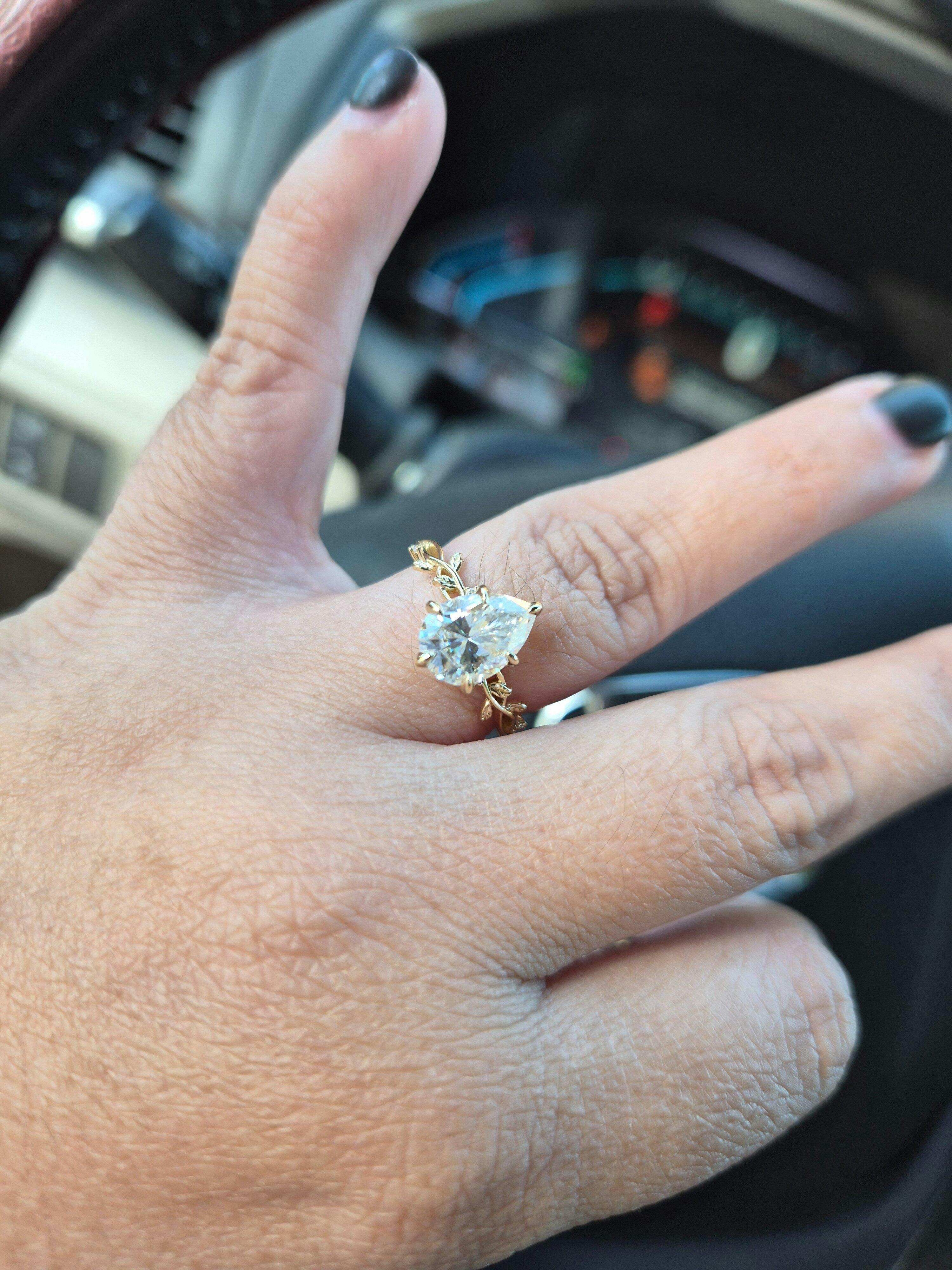 Cradled at its center is a pear center stone of your choice — bright, unwavering, like a promise held between silence and time. Surrounding it is a handcrafted band, intricately carved with vines and forest leaves, evoking the enchanted woods where love takes root and never lets go.