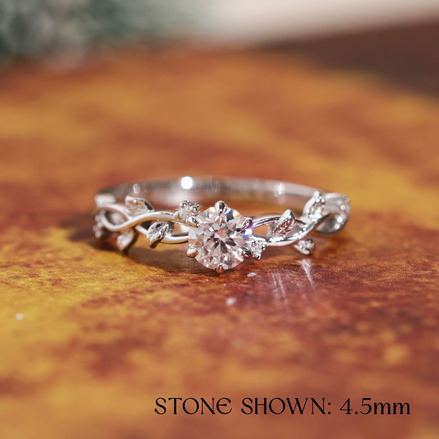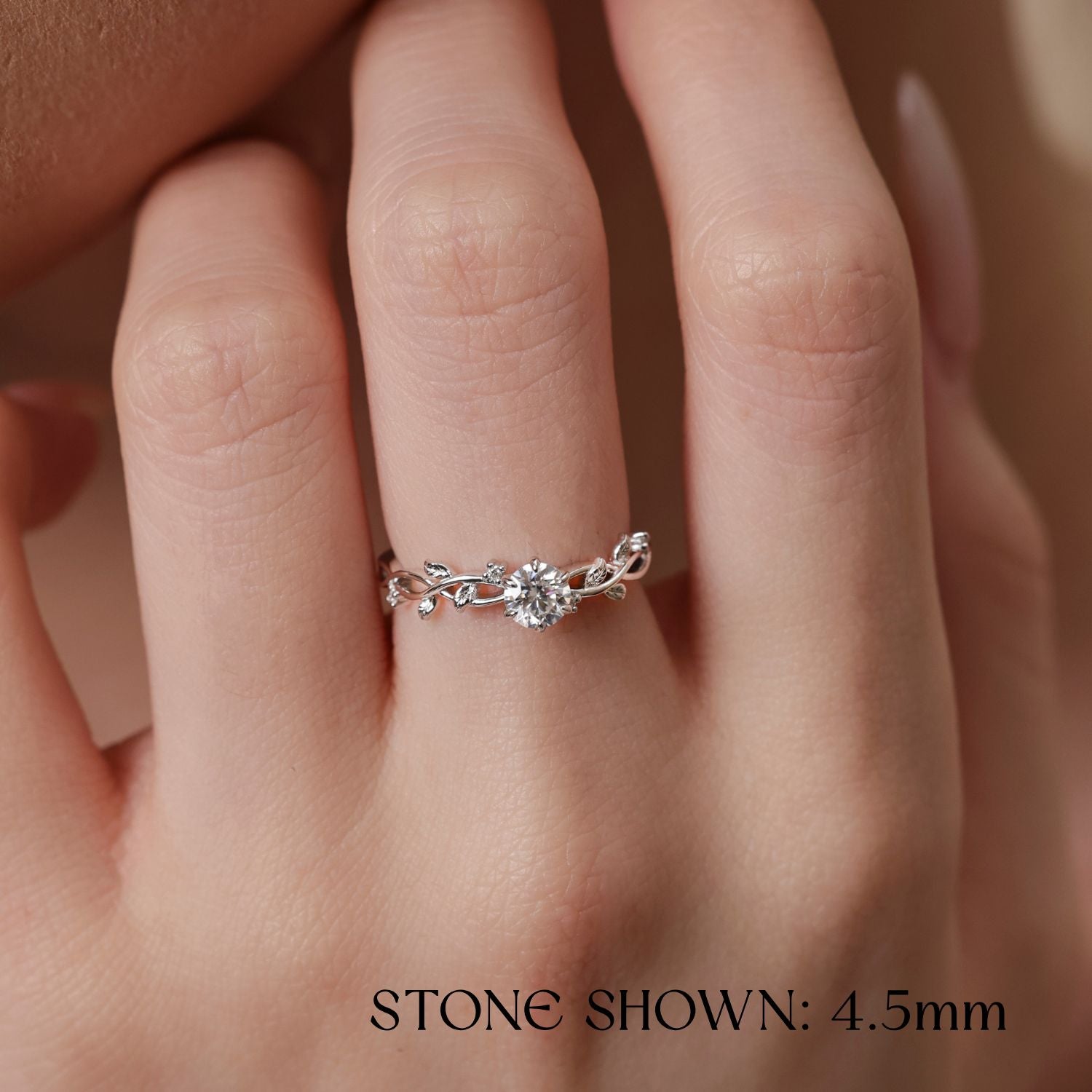 Cradled at its center is a round center stone of your choice — bright, unwavering, like a promise held between silence and time. Surrounding it is a handcrafted band, intricately carved with vines and forest leaves, evoking the enchanted woods where love takes root and never lets go.