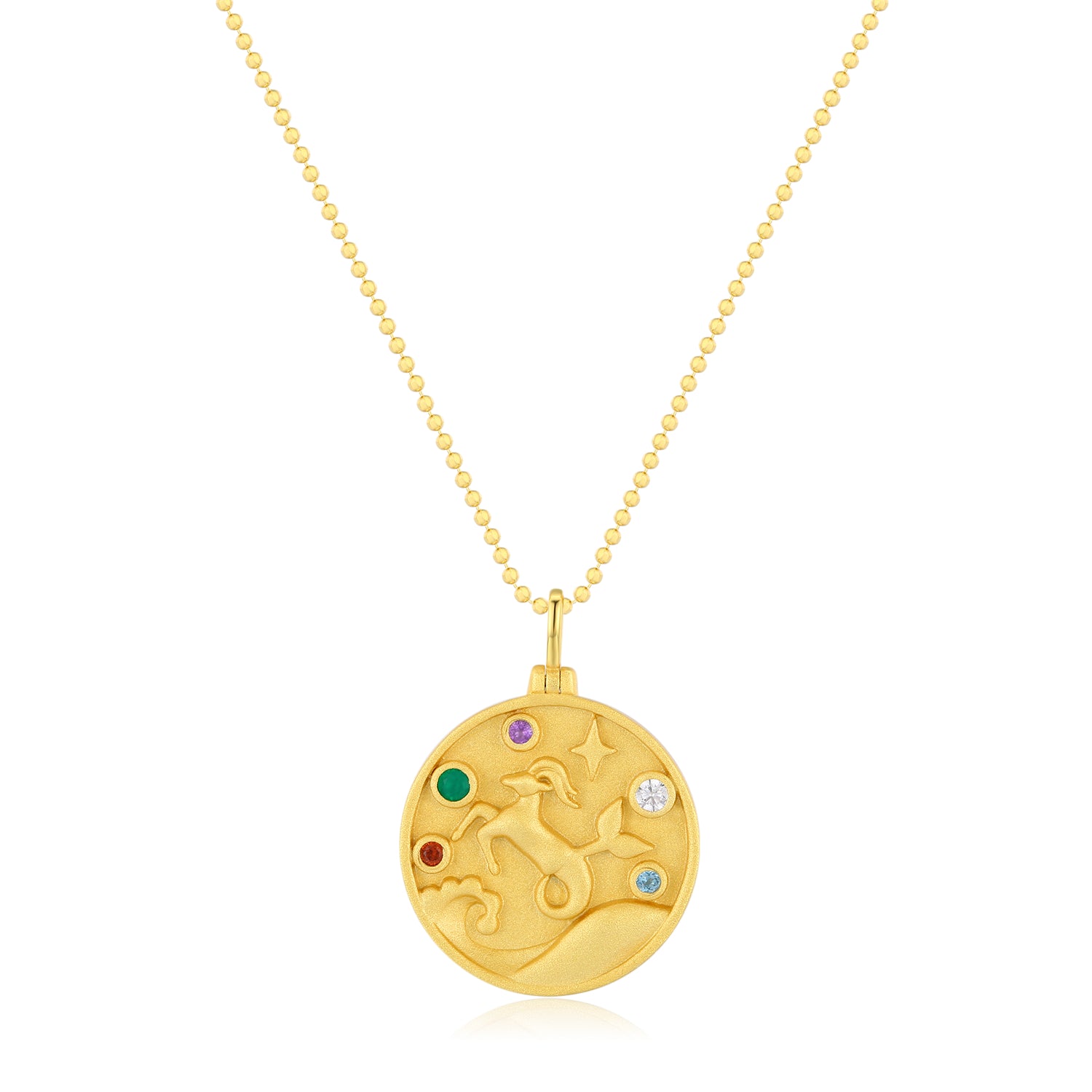 made—the Capricorn Zodiac Mantra Necklace. One side features the Sea-Goat ascending the golden slopes, surrounded by vibrant gemstones.