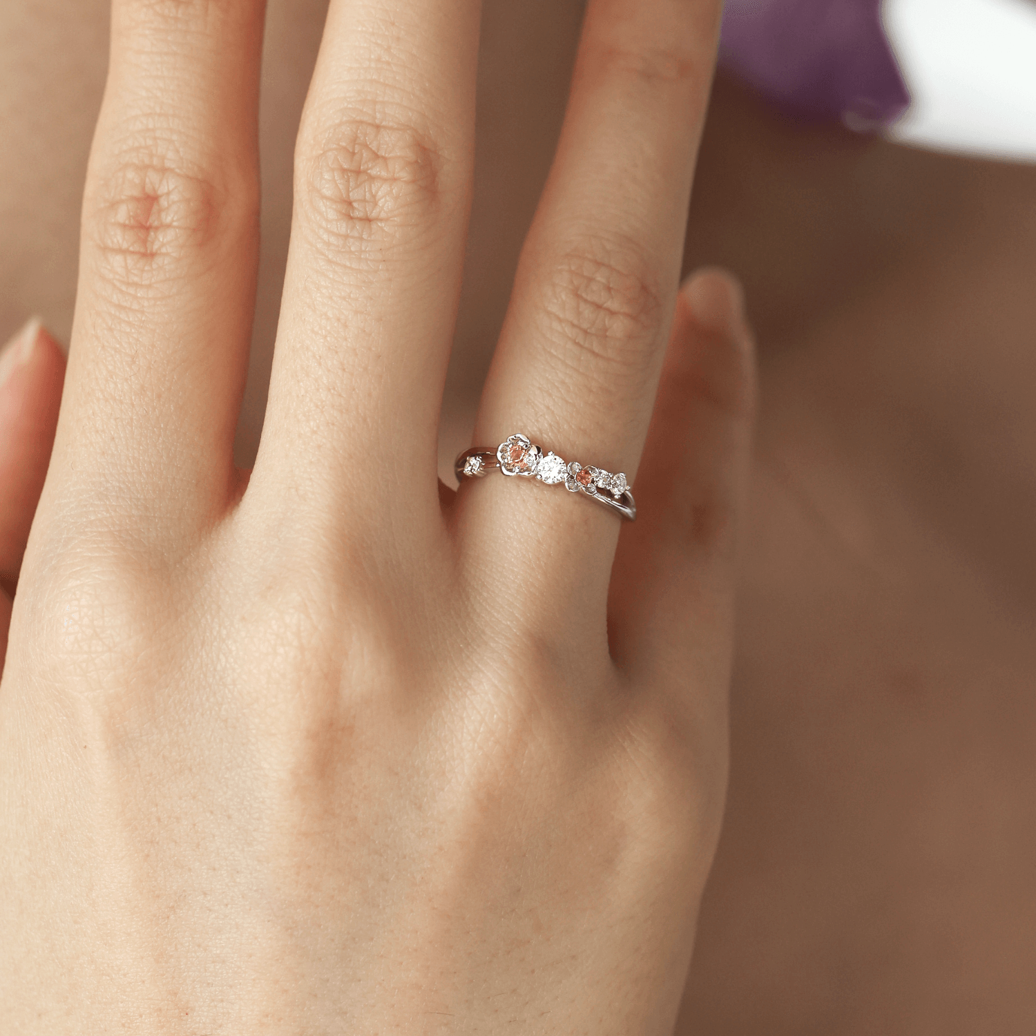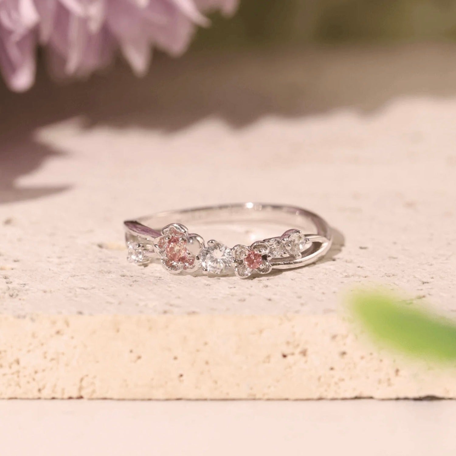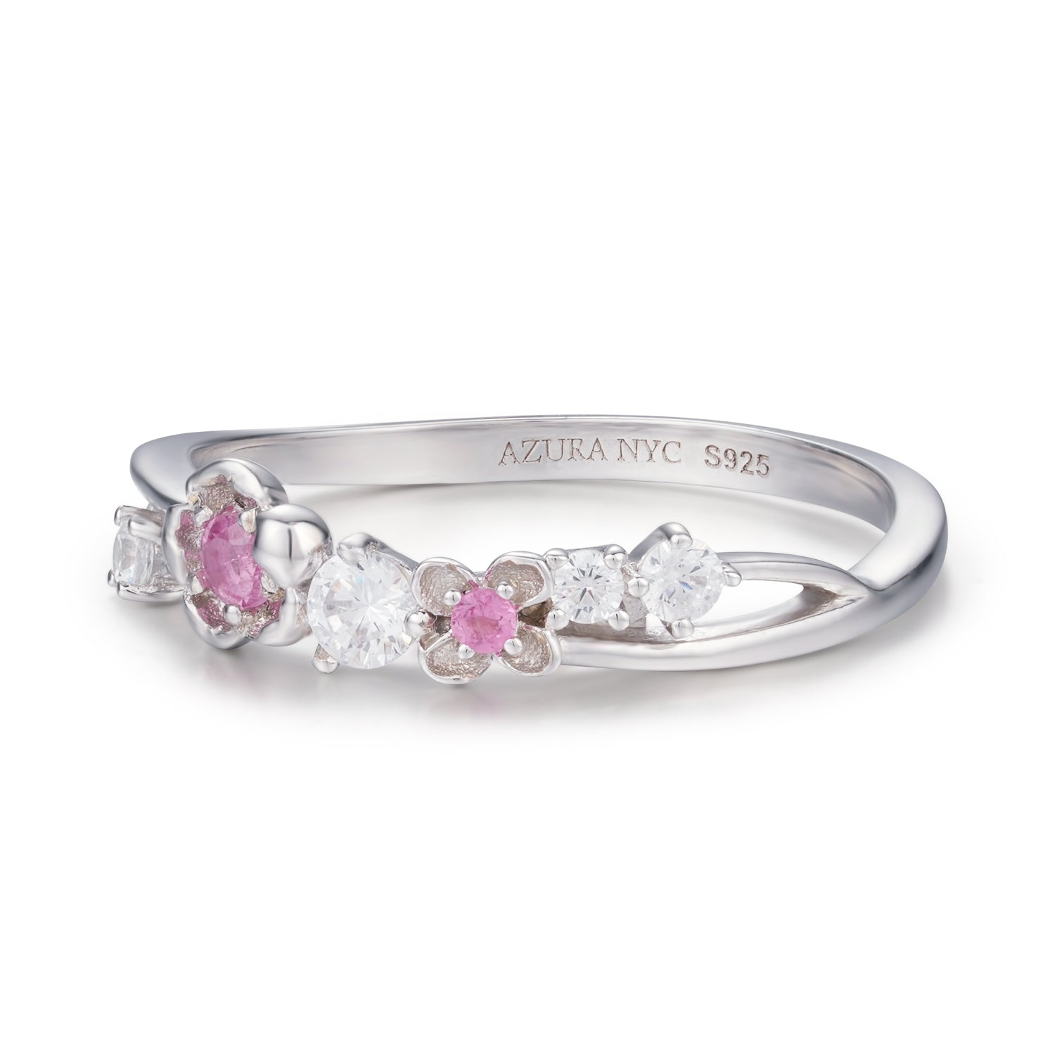 Like the soft fall of sakura petals, the Cherry Blossom Tourmaline Band evokes the tender, passing beauty of love and life in bloom. This delicate floral ring features pink tourmalines and brilliant white accent stones.