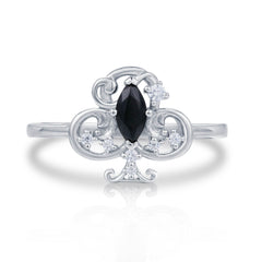 At its heart lies a bold marquise-cut black onyx stone, symbolizing clarity found through challenge and the beauty born in shadow. The ornate, vine-like scrollwork surrounding the gem forms the shape of a blooming clover, while shimmering white topaz accents add light and a touch of renewal.