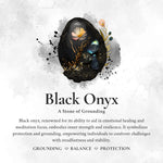 Powers: Revered for its deep black hue and smooth, polished appearance, this gemstone is often associated with protective energies, shielding the wearer from negative influences and absorbing negativity. It is thought to instill a sense of stability, strength, and self-control, aiding in decision-making and fostering resilience during challenging times. Emotionally, black onyx is believed to facilitate healing by absorbing and transforming negative energies, promoting emotional well-being, and releasing past traumas.