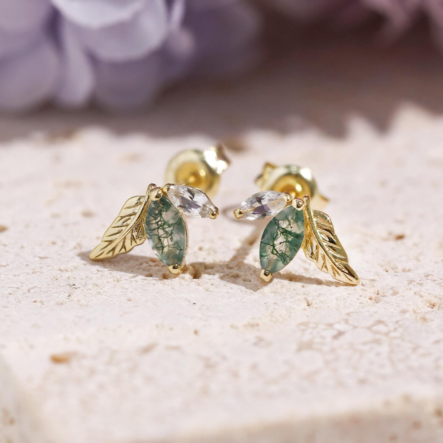 Set in delicate leaf-shaped settings, the moss agate stones are paired with sparkling accent stones that mimic the fresh dew on morning foliage, enhancing the organic charm of the design.