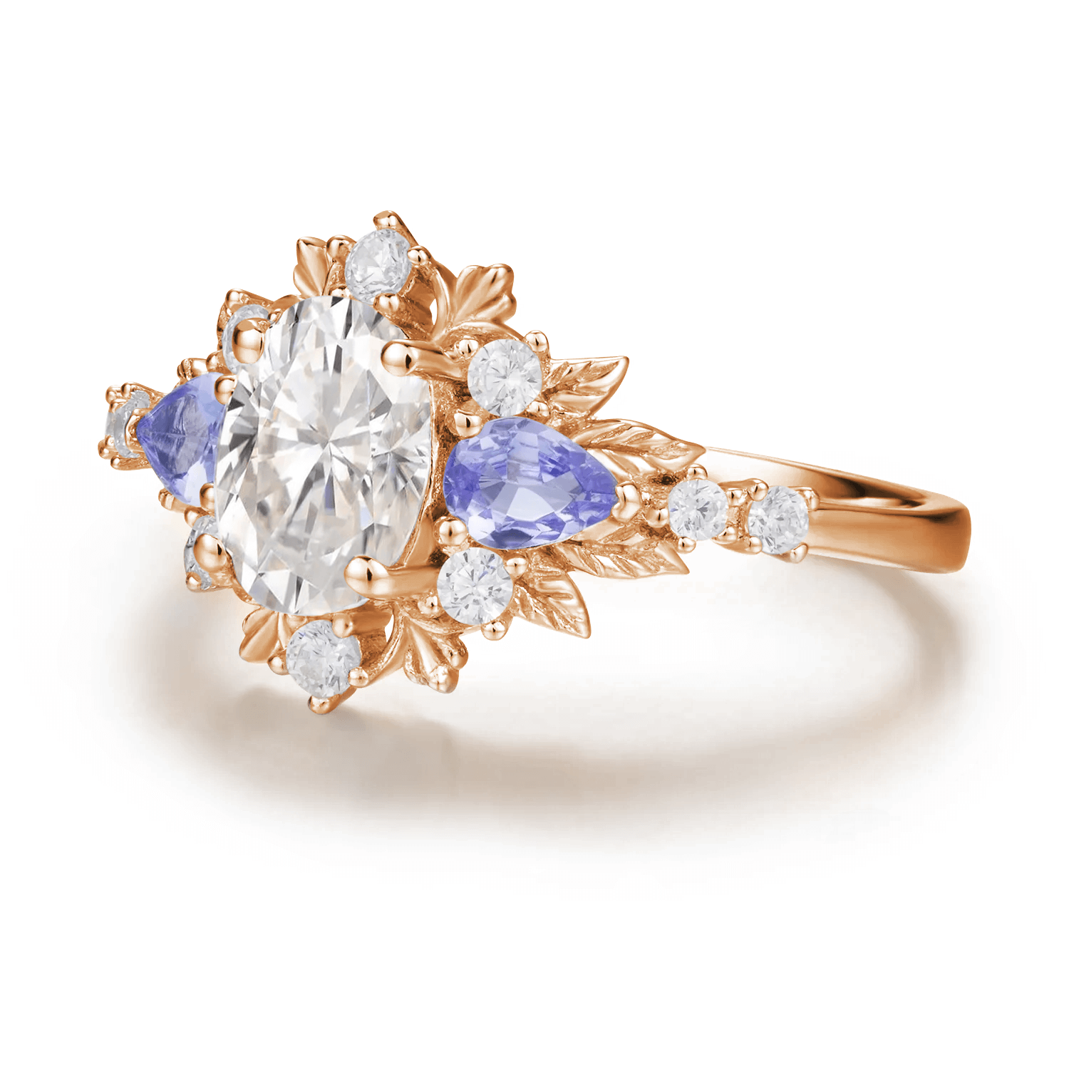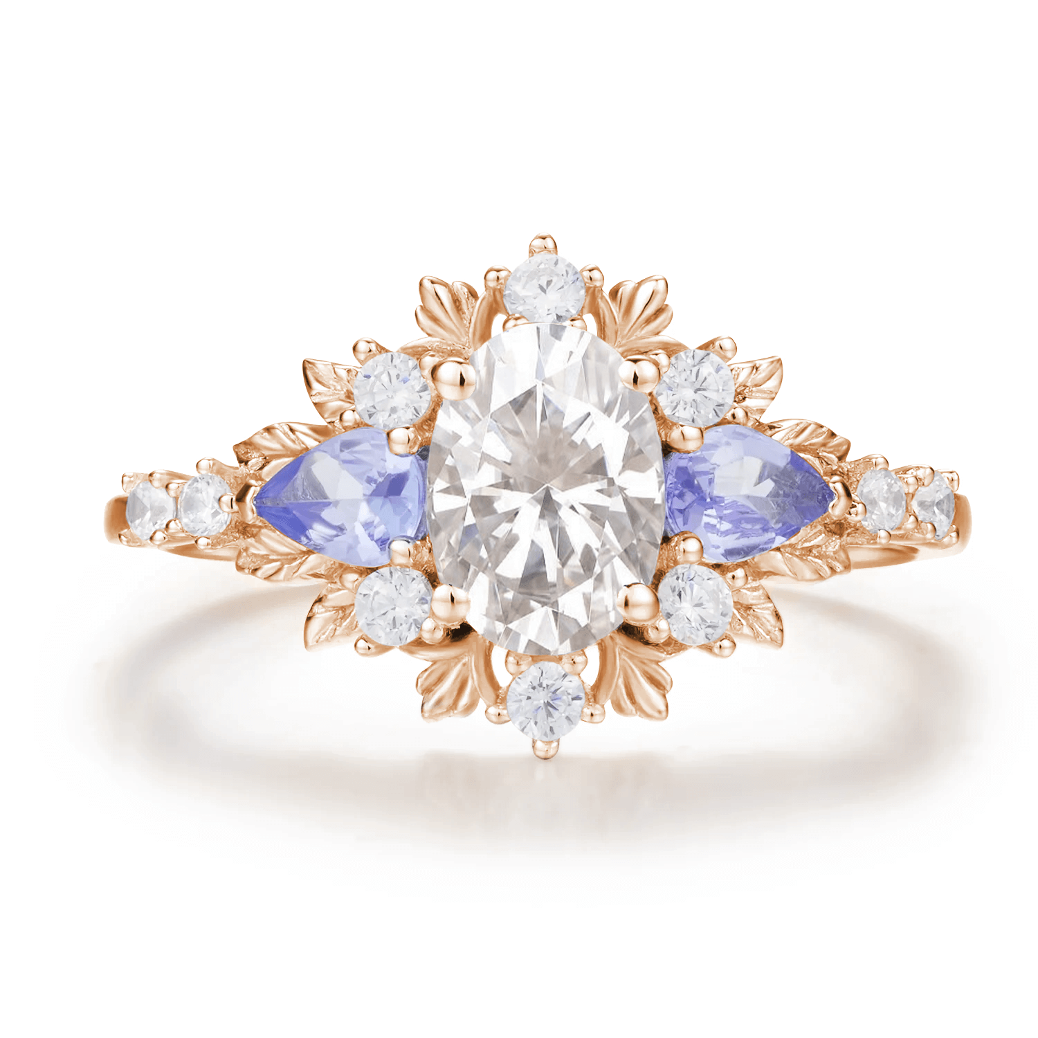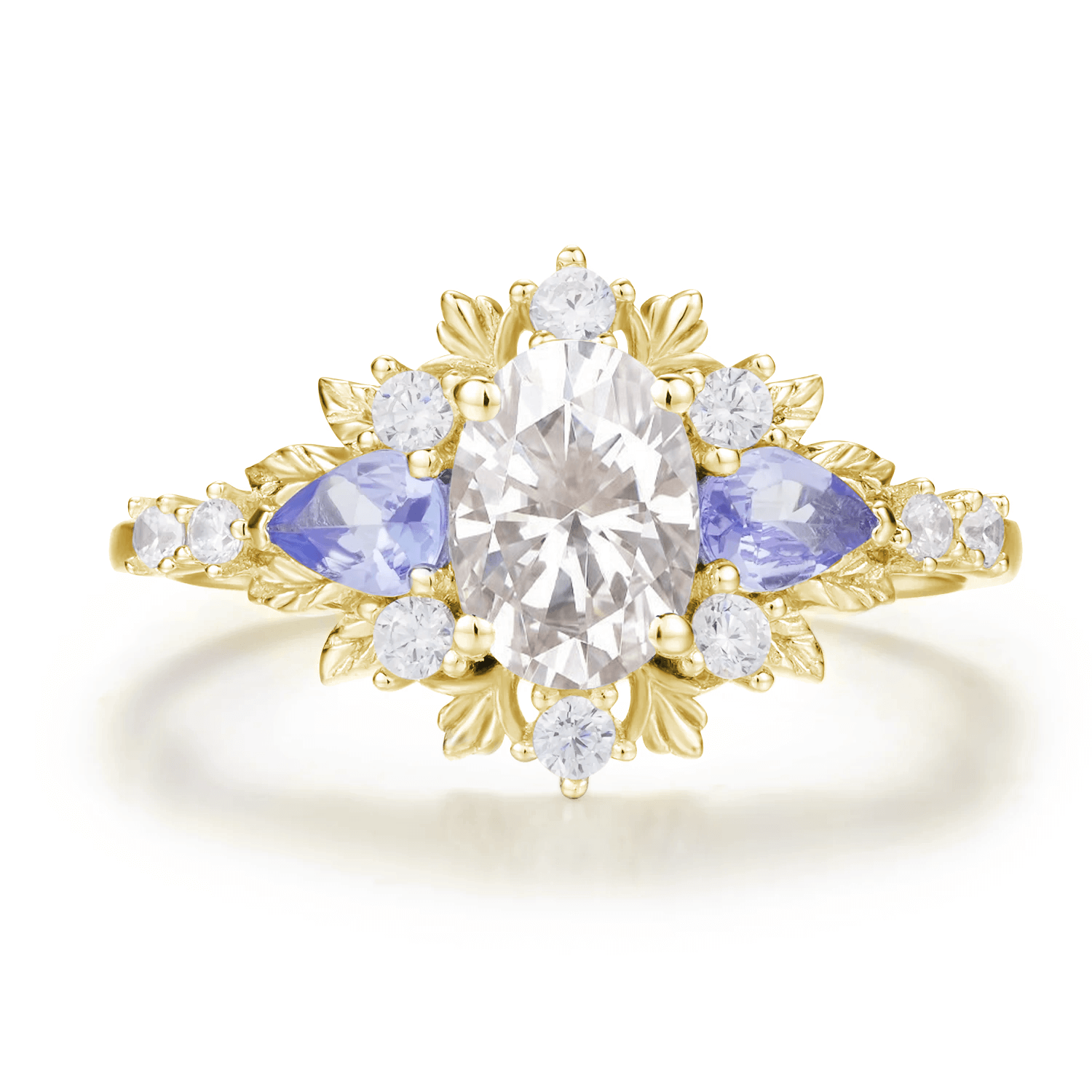 At the center, a brilliant oval cut moissanite glows with star-like fire, while two pear-shaped tanzanites on either side add soft violet hues reminiscent of twilight. A halo of moissanite stones surrounds the centerpiece, forming a flower-like silhouette.