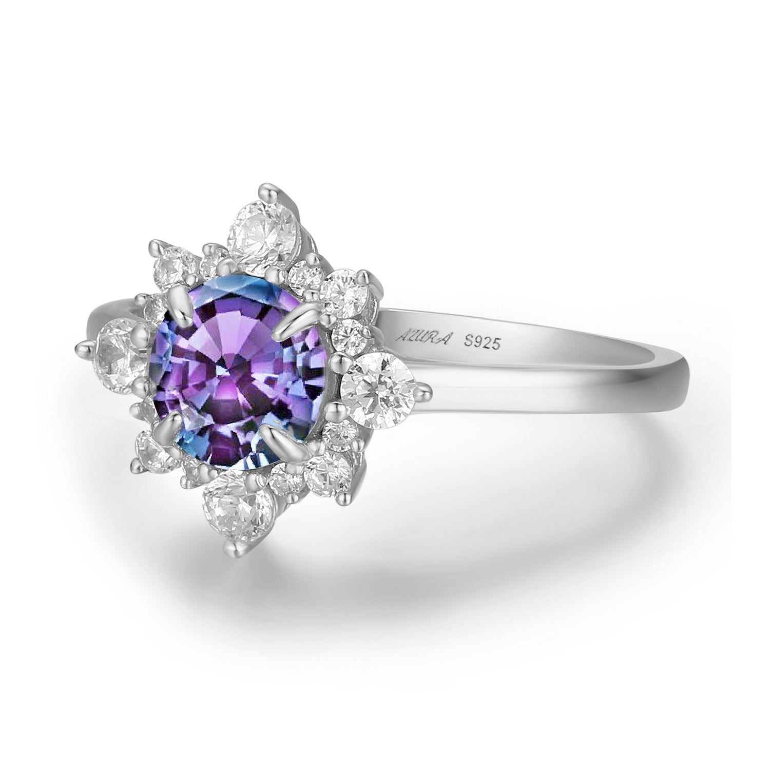 The Desert Blossom Alexandrite Ring captures the quiet strength of a flower that blooms in silence and the magic of a gemstone that changes with the light. At its center is a round alexandrite, known for its mesmerizing shift between deep violet and twilight blue, like the changing hues of dusk in a desert sky. It is framed by a halo of sparkling diamond-like stones in a floral silhouette.