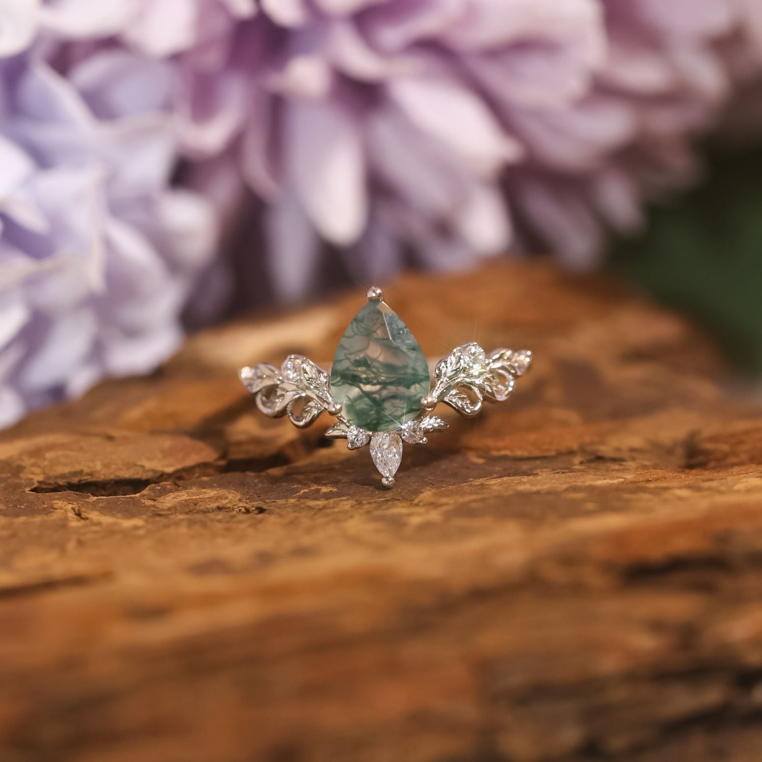 ✦ Center Stone: 6x8mm pear Moss Agate