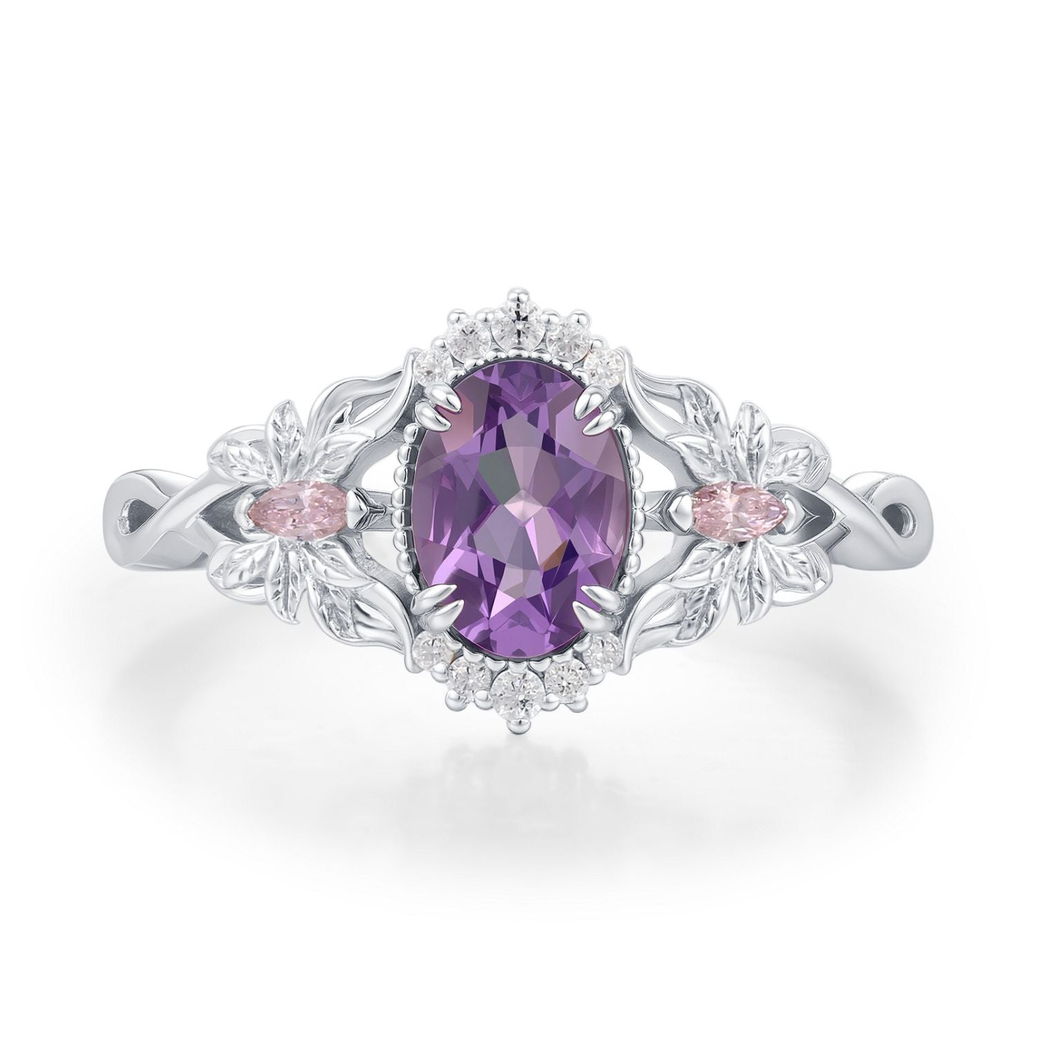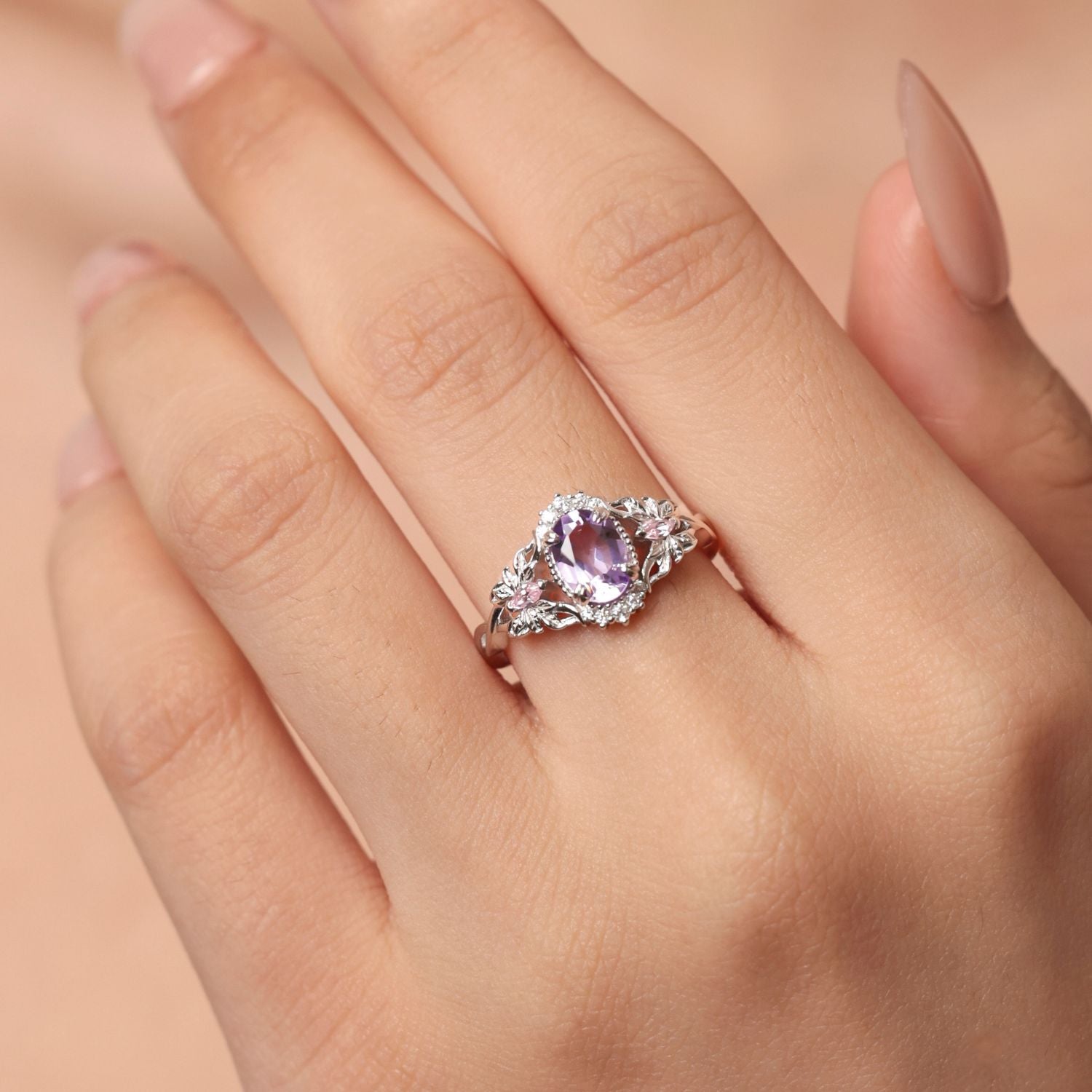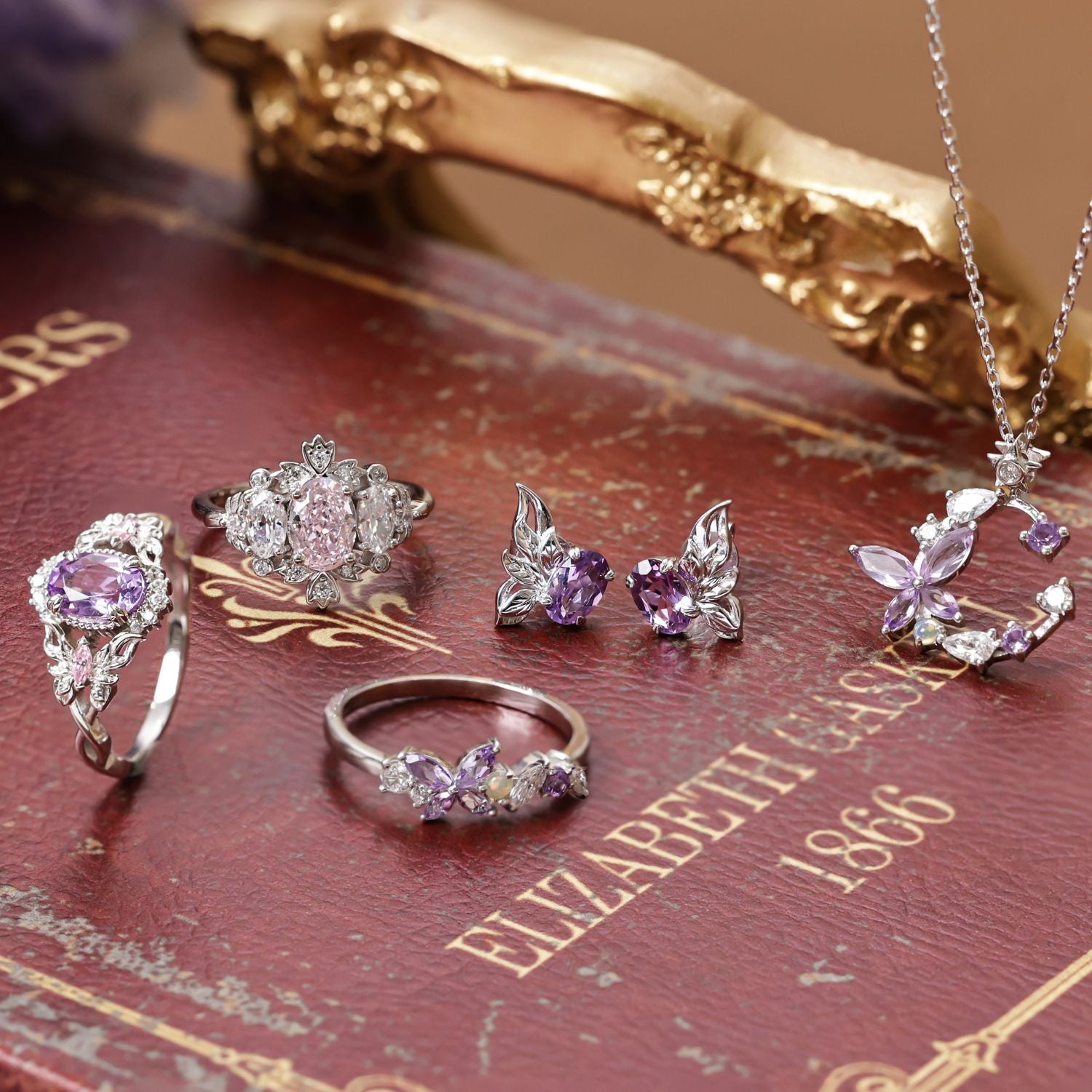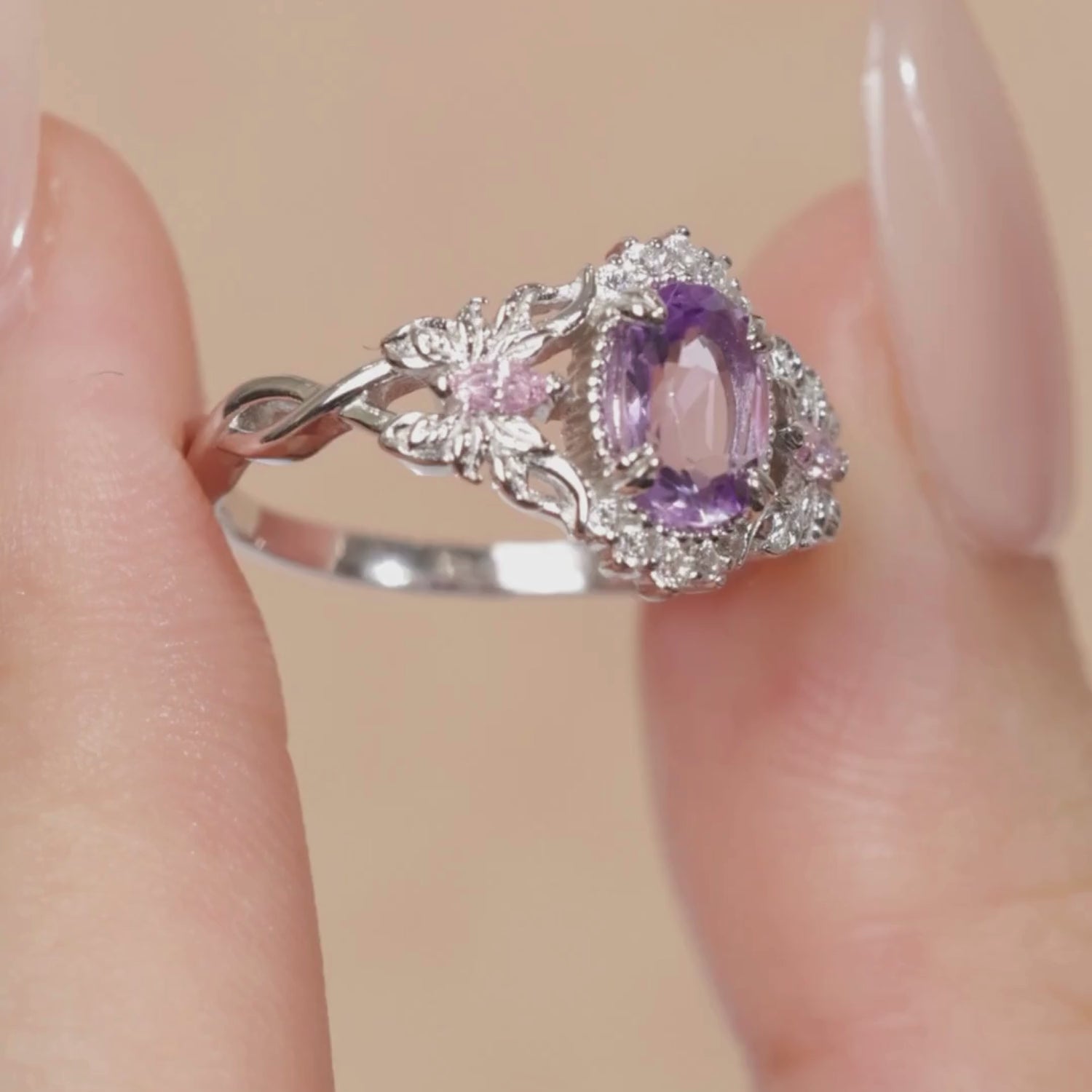 Let your story take flight. Inspired by the transformation and quiet strength of butterflies, the Elaria Amethyst Ring is a tale of change, courage, and inner fire. An oval-cut amethyst center stone is framed by two delicately sculpted butterflies, their wings glimmering with marquise pink tourmaline stones and round diamond-like accents. Elegant, intricate, and full of meaning—this ring is a tribute to those who choose to rise.