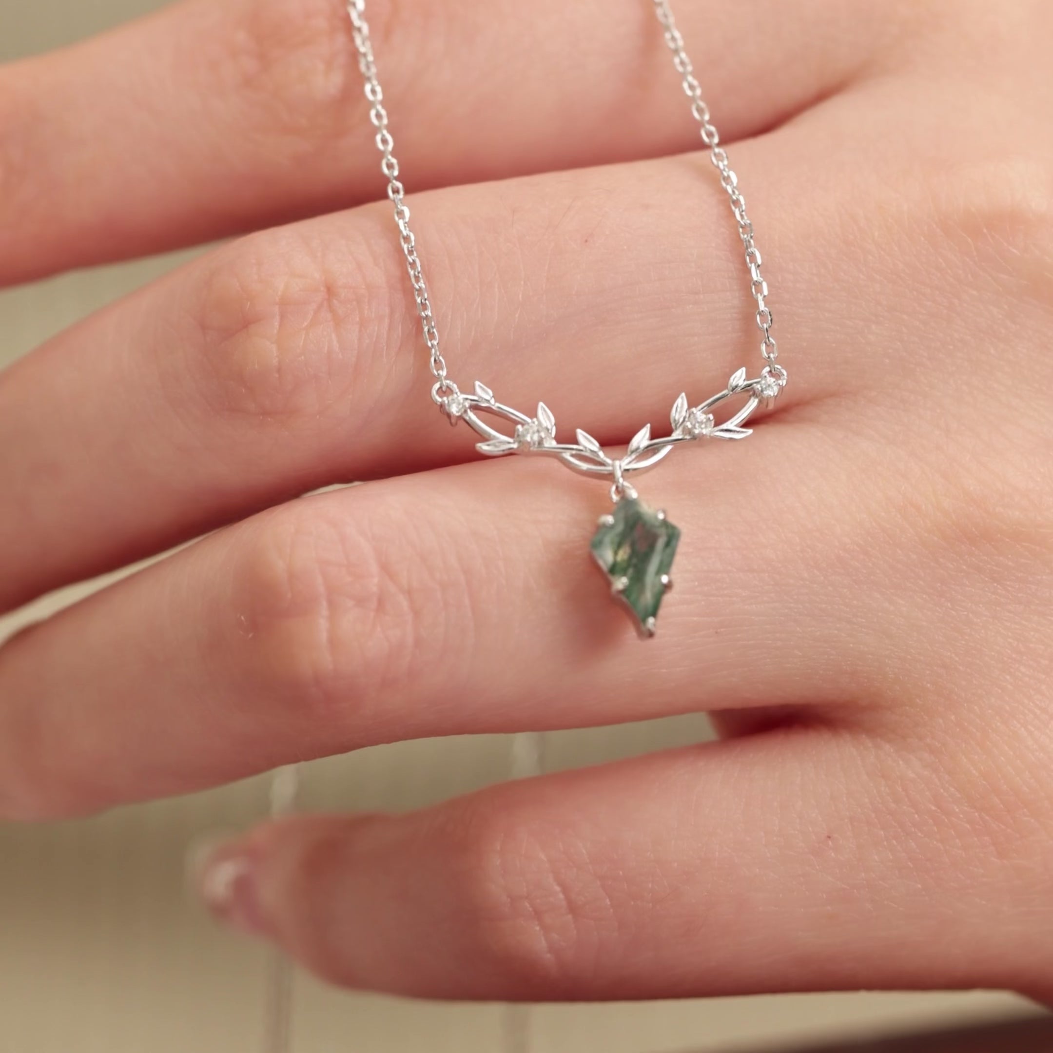 The kite moss agate gemstone, with its natural green veining and earthy depth, embodies the elven reverence for quiet growth and inner harmony, reflecting the grounded, ever-deepening journey of the soul. Wrapped in a delicate chain, intricate vine and leaf motifs twist gracefully around the centerpiece, echoing the sacred forms of climbing ivy.