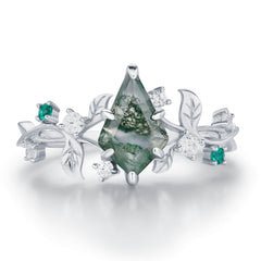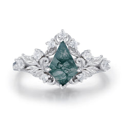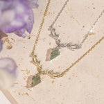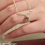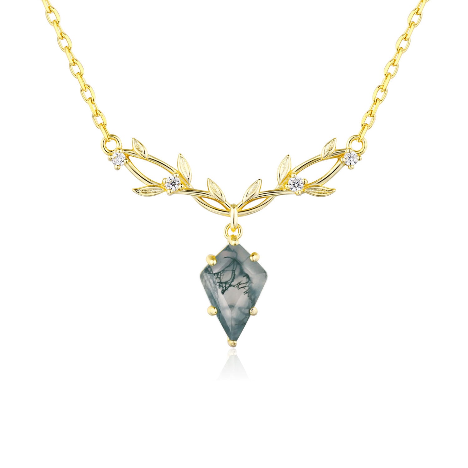 The kite moss agate gemstone, with its natural green veining and earthy depth, embodies the elven reverence for quiet growth and inner harmony, reflecting the grounded, ever-deepening journey of the soul. Wrapped in a delicate chain, intricate vine and leaf motifs twist gracefully around the centerpiece, echoing the sacred forms of climbing ivy.