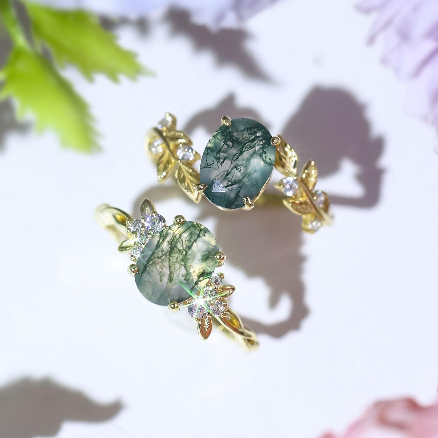 Wander into the heart of the forest with the Enchanted Garden Oval Cut Moss Agate Ring, a spellbinding piece featuring an oval moss agate gemstone. Each moss agate is naturally formed with one-of-a-kind green inclusions, resembling enchanted gardens, trees, or serene landscapes. A gemstone of growth and balance that grounds your spirit.