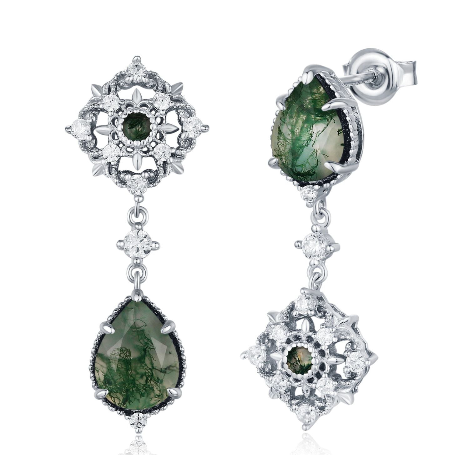 Celebrate the beauty of cosmic imbalance with this stunning pair of asymmetrical dangle earrings inspired by celestial rhythms and nature’s imperfect harmony. Crafted in 14K white gold vermeil, these elegant earrings feature orbit-like detailing and moss agate gemstones that evoke the mystery of stars, planets, and the paths we travel through life.
