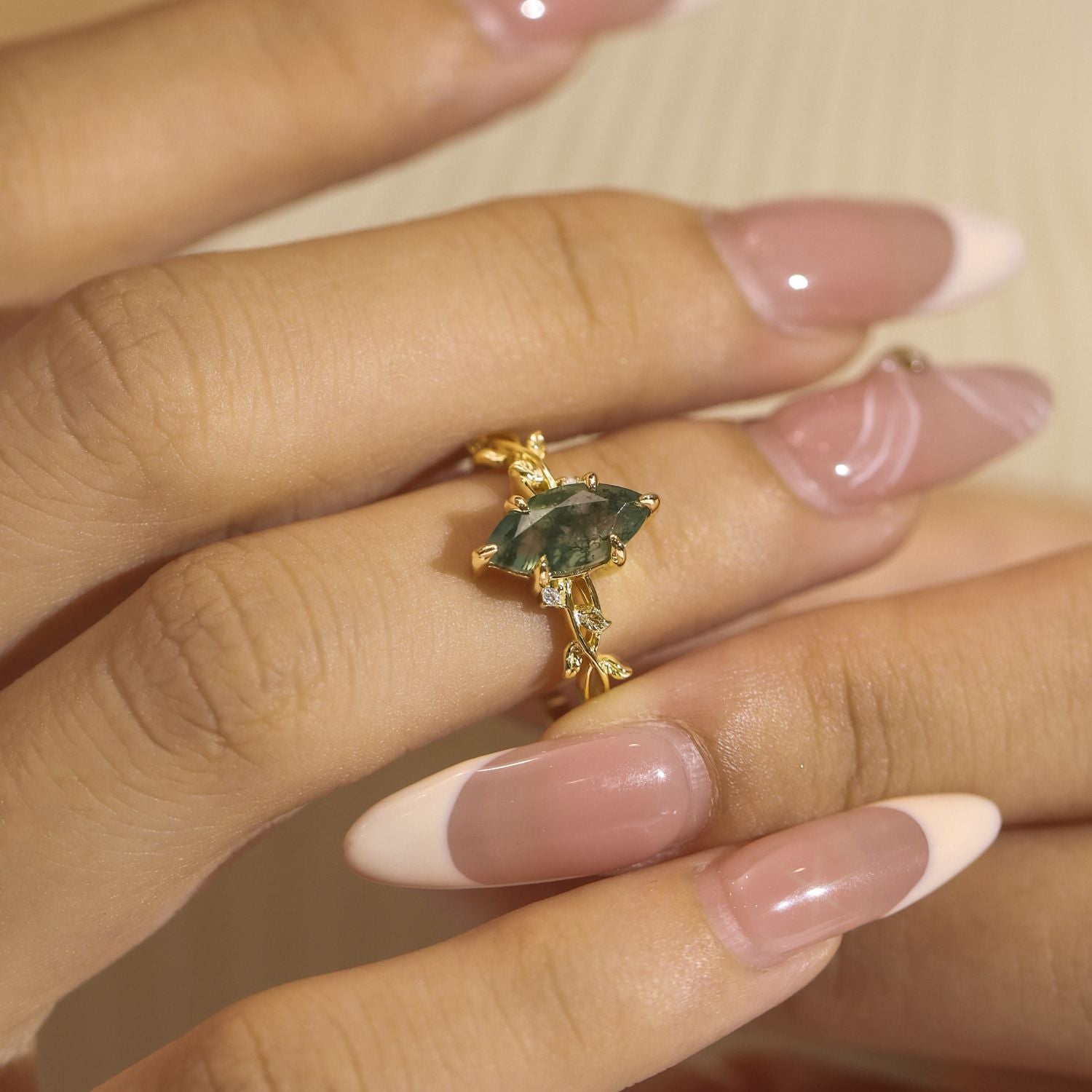 Cradled at its center, the marquise moss agate glows with earthy enchantment — its soft green threads swirling like ancient forest paths, each stone a portal to a moment that never ends. Surrounding it is a handcrafted band, intricately carved with vines and forest leaves, evoking the enchanted woods where love takes root and never lets go.