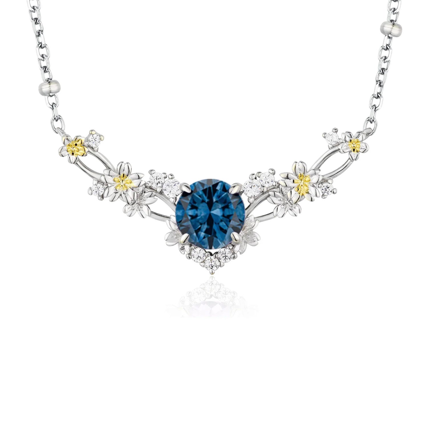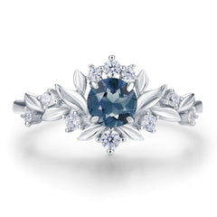 At its heart lies a deep, round London blue topaz gemstone glowing with the depth of the midnight sea. Surrounding it, delicate silver blossoms touched with hints of gold sparkle like flowers kissed by moonlight and dew.