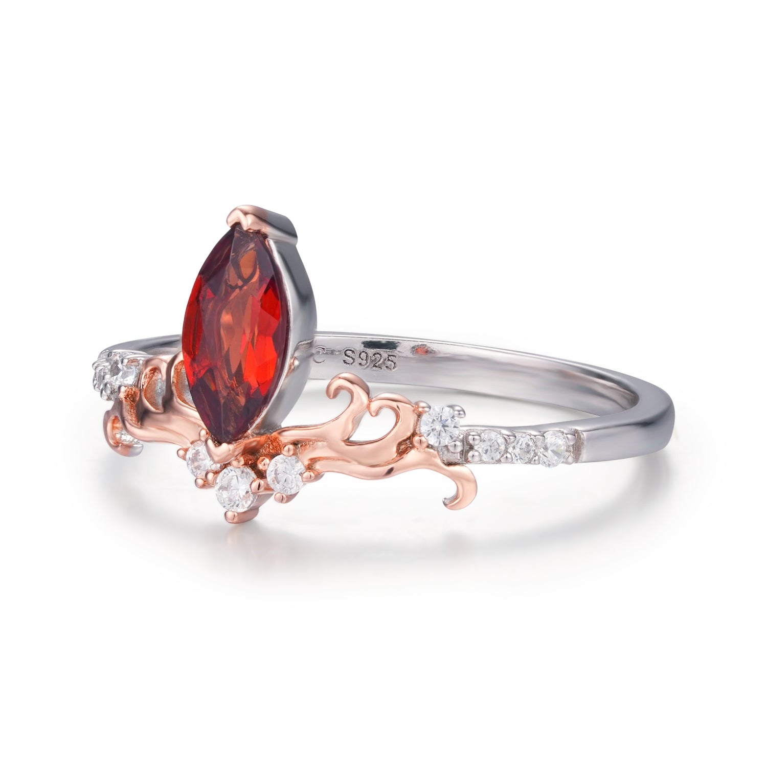 At its heart, a fiery marquise-cut Mozambique red garnet glows like a living ember, held in a rose-gold flame. Three delicate white accent stones rest beneath the garnet, shimmering like dancing sparks. Each one represents clarity, rebirth, and unwavering will.