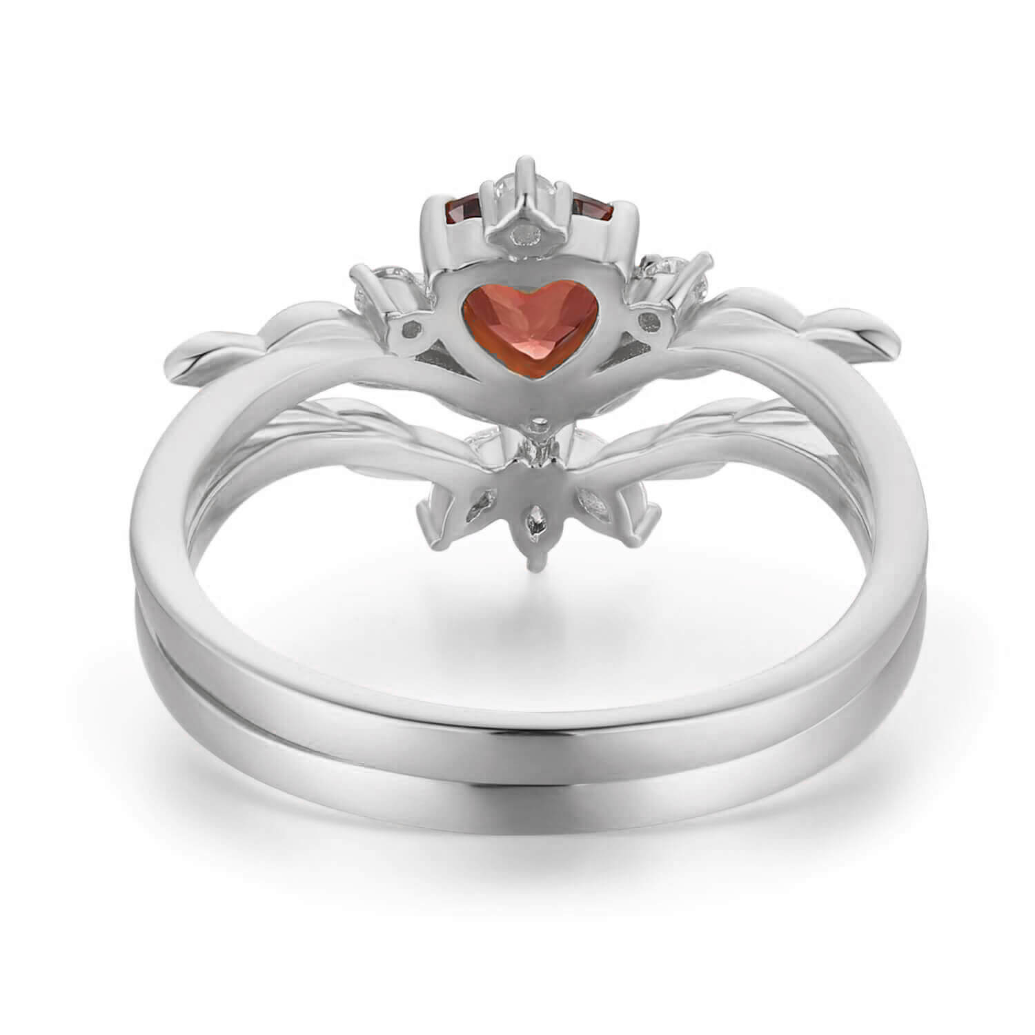 At its center, the main ring band holds a heart-shaped red garnet, glowing with fiery depth and wrapped in golden, leaf-like accents that speak of passion, devotion, and a love meant to last.