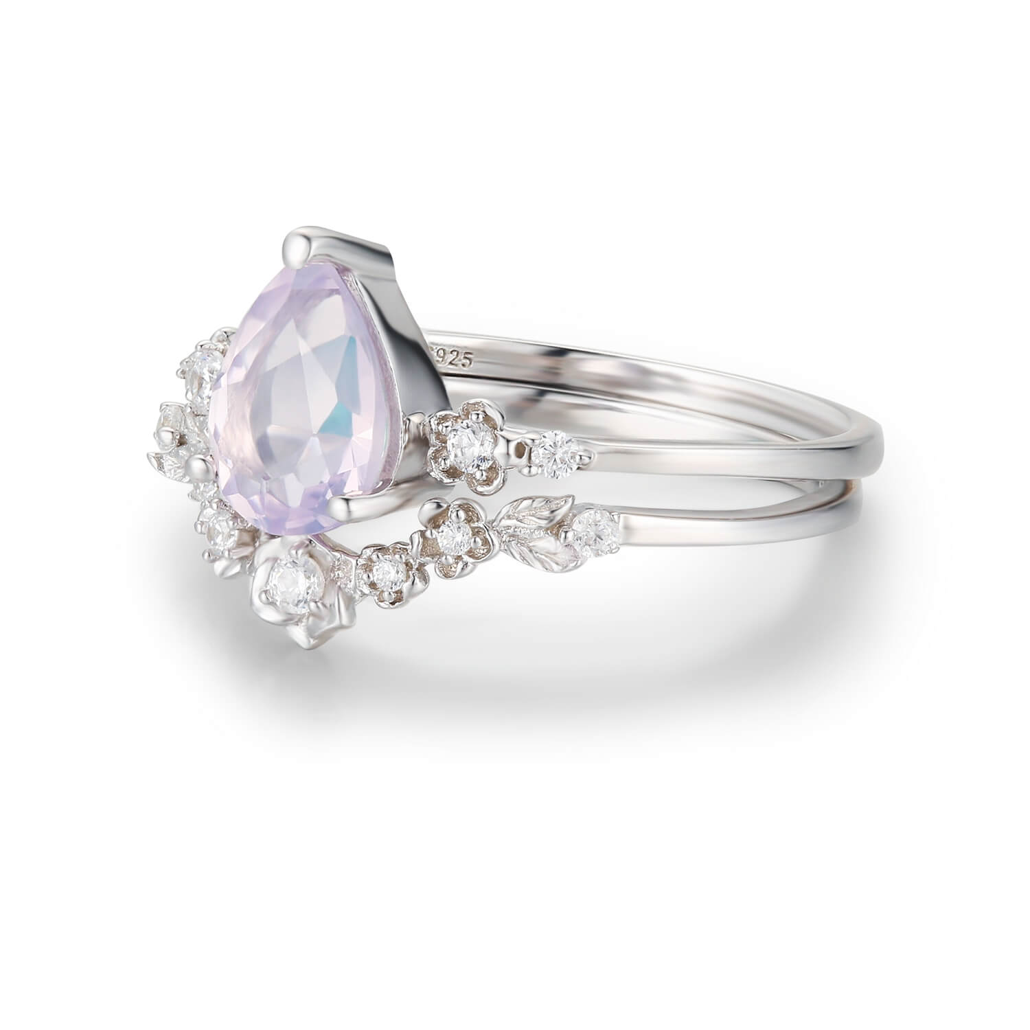 This pair features a dreamy pear-shaped lavender amethyst center stone cradled in a delicately sculpted floral band.