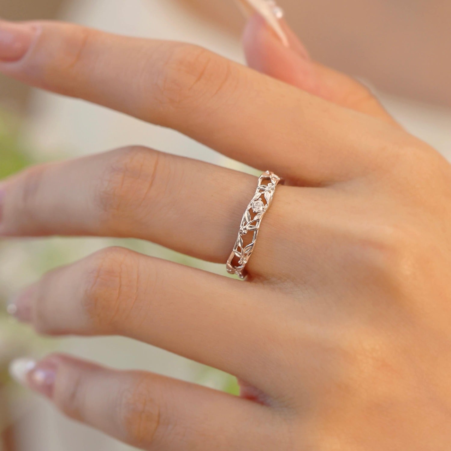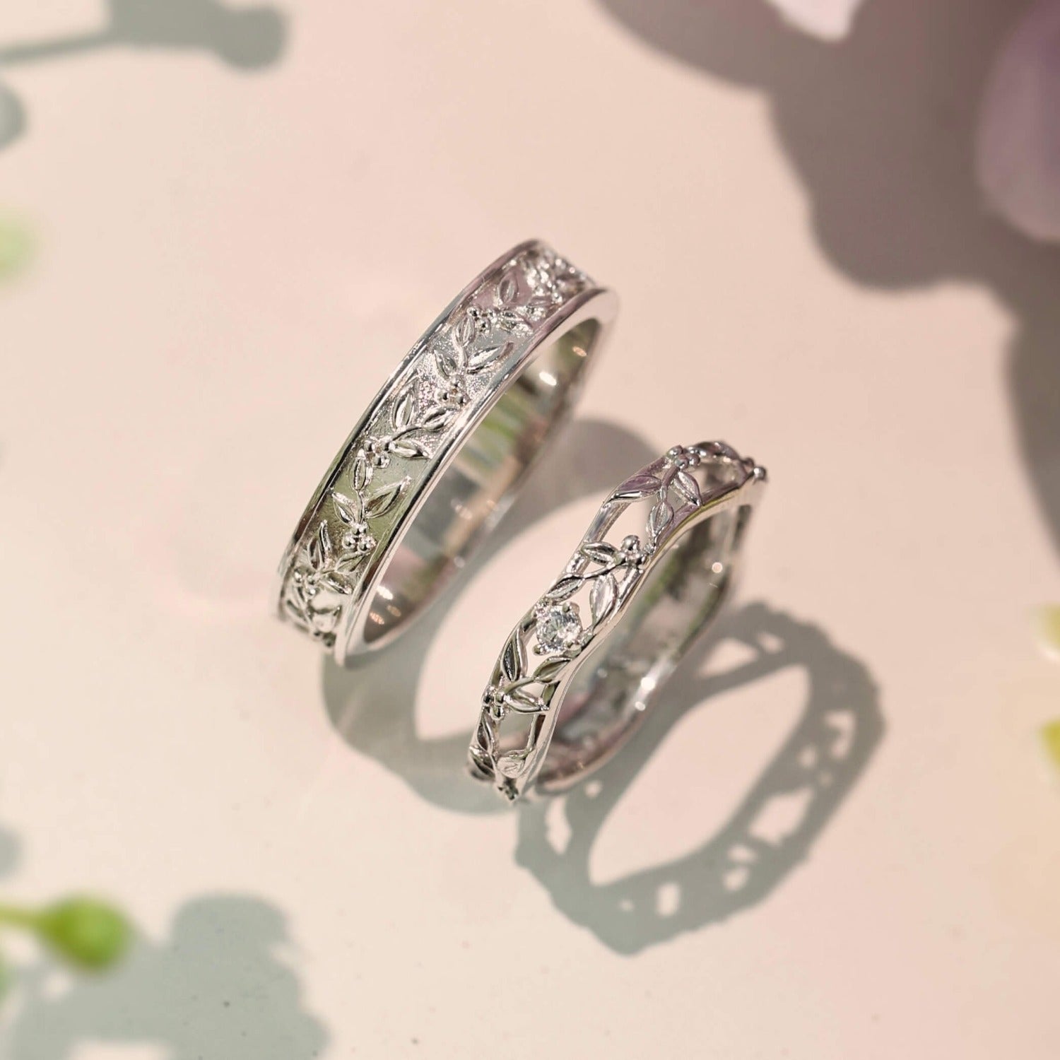 The male ring, refined and grounded, reflects the same botanical motif in a clean, leaf-engraved design that speaks of strength, growth, and resilience.