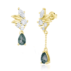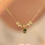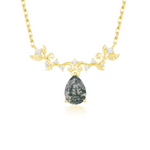 This nature-inspired necklace showcases a pear-shaped moss agate pendant delicately hanging from whimsical silver vines adorned with sparkling white topaz stones, each one capturing the light like dew on leaves.