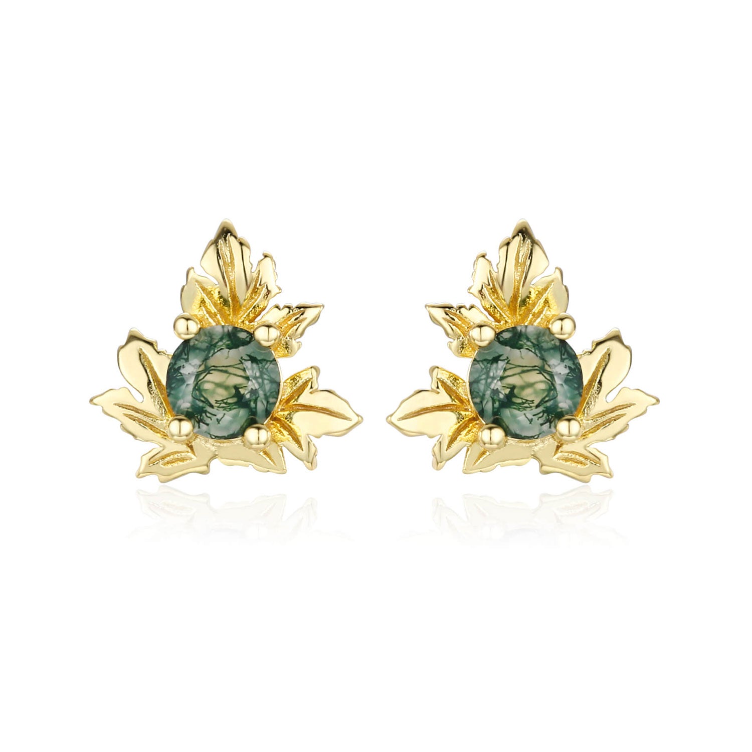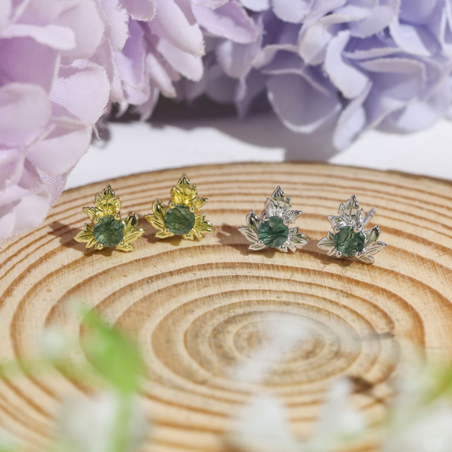 Each stud features a round moss agate gemstone, prized for its unique green, fern‑like inclusions that look like tiny forests captured in stone. Surrounded by intricately detailed fern leaves, these earrings embody both the delicate sparkle of frost and the quiet strength of nature.