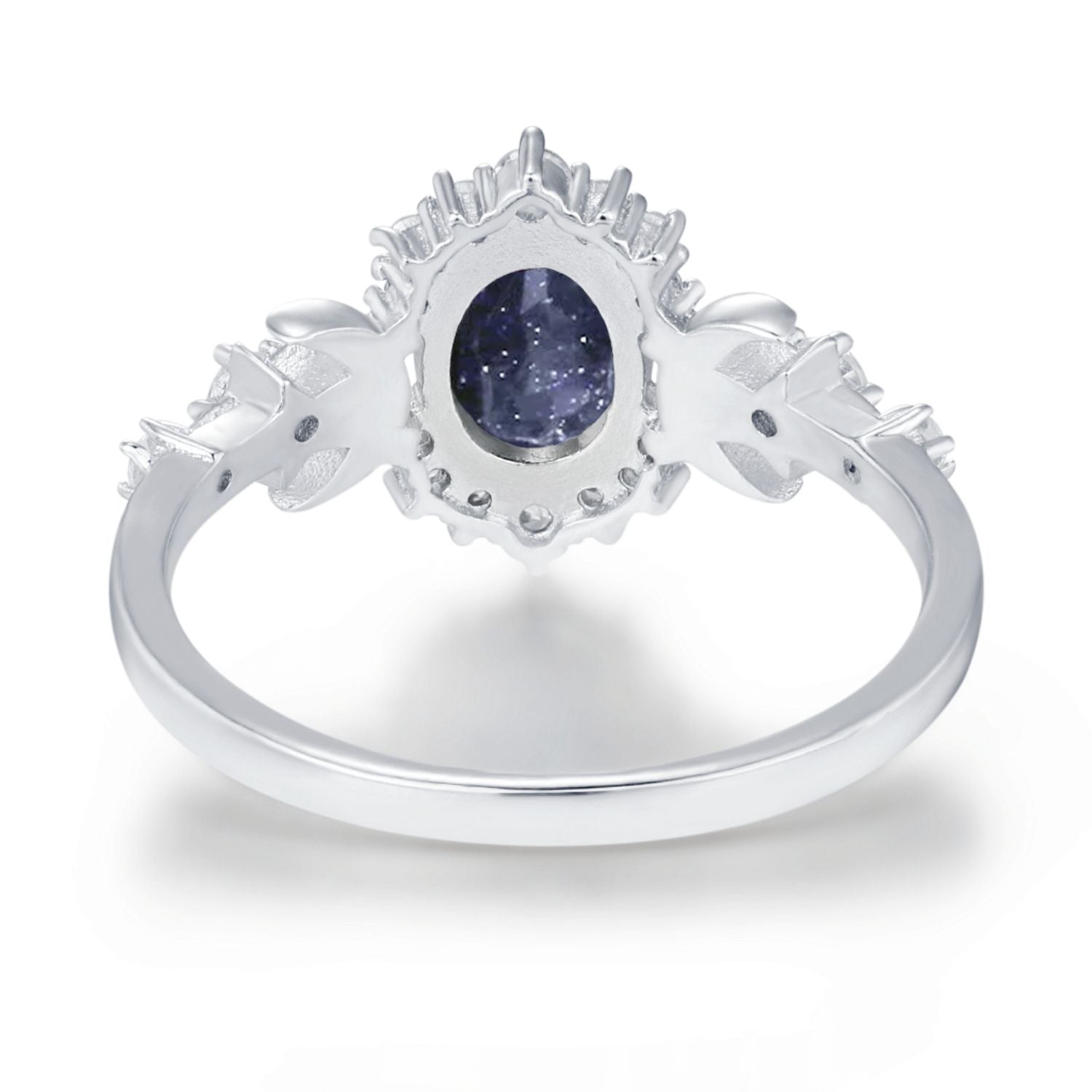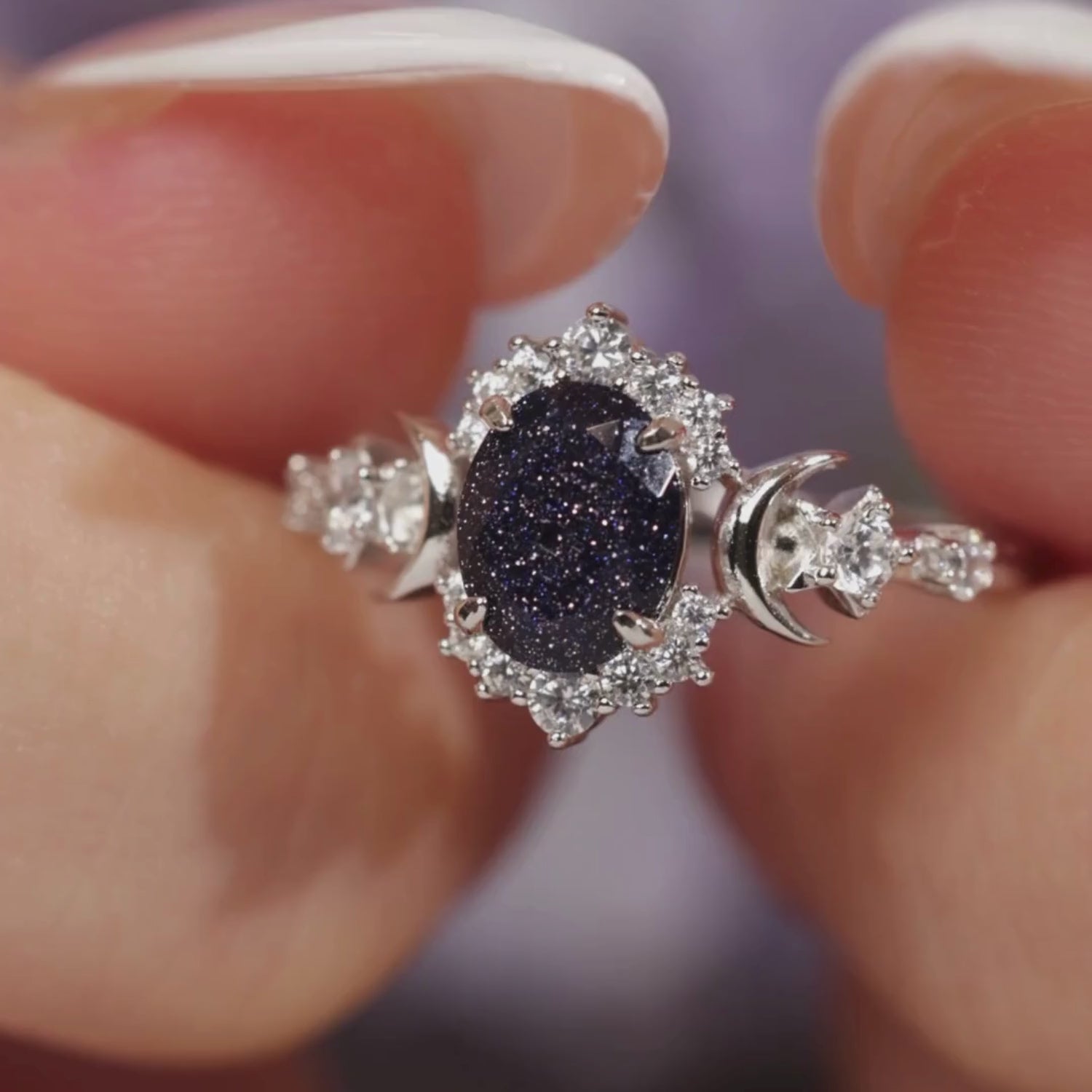 At its center, a rich oval-shaped blue sandstone glows like a shimmering drop of pure cosmic light. Encircled by a delicate halo of white accent stones and adorned with delicate crescent moons and twinkling stars on the band, this galaxy ring embodies renewal, transformation, and eternal connection.