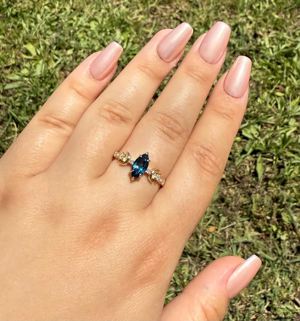 At its center, a rich oval-shaped London blue topaz glows like a shimmering drop of pure cosmic light. Encircled by a delicate halo of white accent stones and adorned with tiny crescent moons and twinkling stars on the band, this London blue topaz ring embodies renewal, transformation, and eternal connection.
