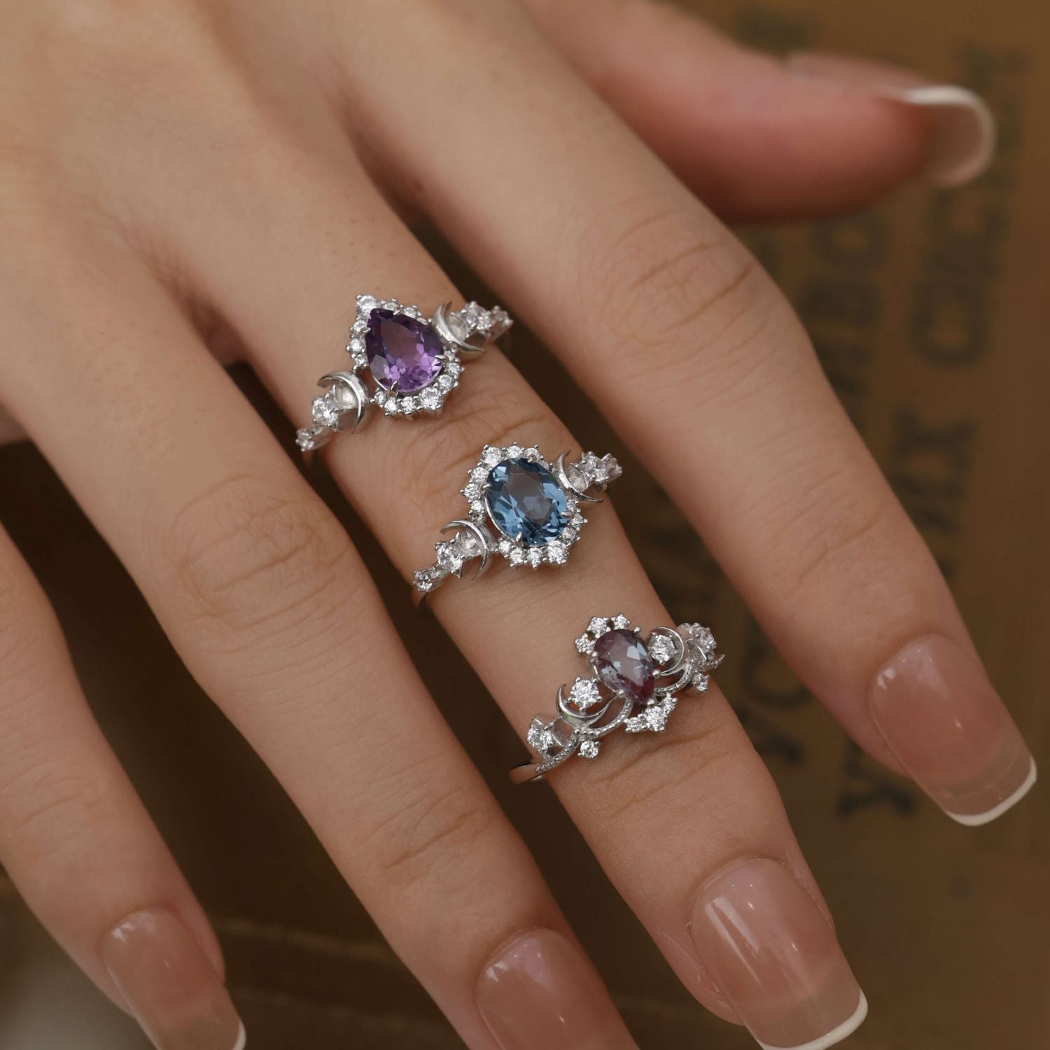 At its center, a rich oval-shaped London blue topaz glows like a shimmering drop of pure cosmic light. Encircled by a delicate halo of white accent stones and adorned with tiny crescent moons and twinkling stars on the band, this London blue topaz ring embodies renewal, transformation, and eternal connection.