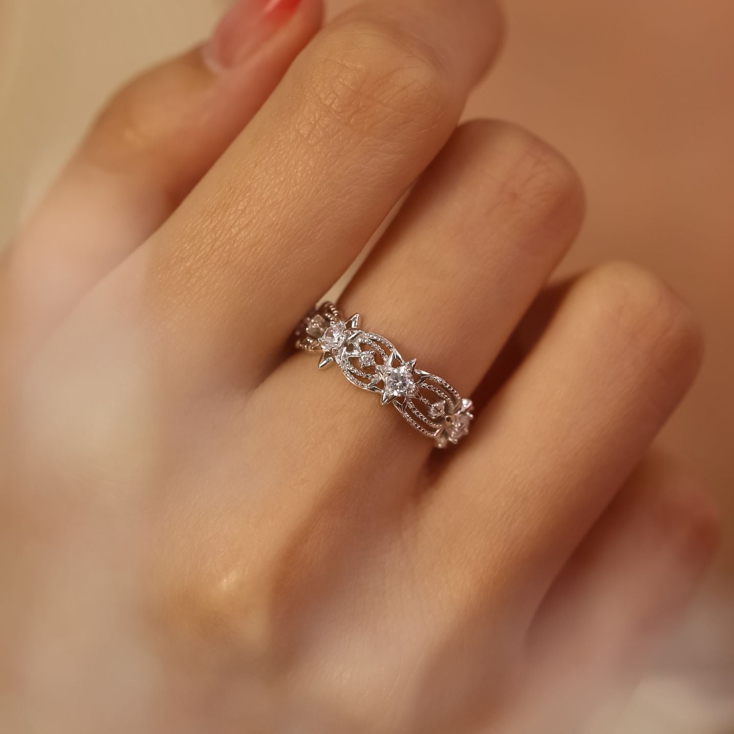 Discover the Garden of Stars Ring, a breathtaking lace-inspired eternity band that captures the wonder of the night sky.