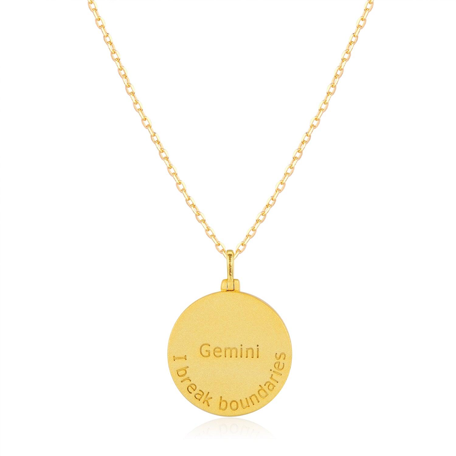 On one side, the Twins are intricately engraved, representing curiosity, adaptability, and the fearless pursuit of new horizons. The reverse side bears the empowering mantra: Gemini – “I break boundaries.” Worn close to the heart, this necklace serves as a daily reminder of freedom, bold self-expression, and the beauty of embracing duality.