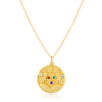To honor this cosmic task, a talisman was made—the Gemini Zodiac Mantra Necklace. One side features the twins standing side by side, surrounded by vibrant gemstones.