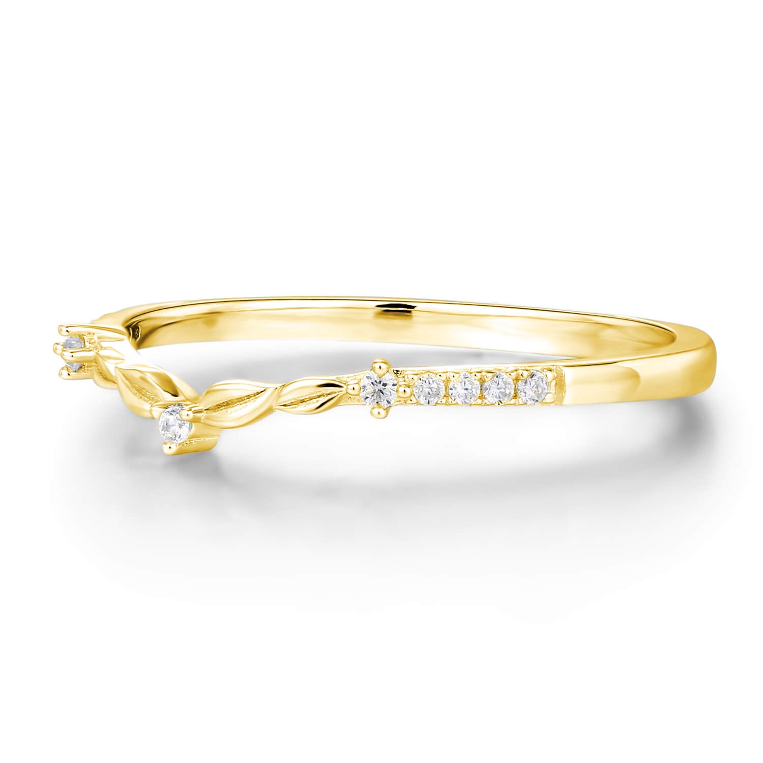 Discover the enchanting beauty of this delicate nature-inspired stacking ring designed to bring ethereal elegance to your everyday style. This band features a whimsical arrangement of leaf motifs and shimmering gems that captures the light like morning dew on an orchid petal.