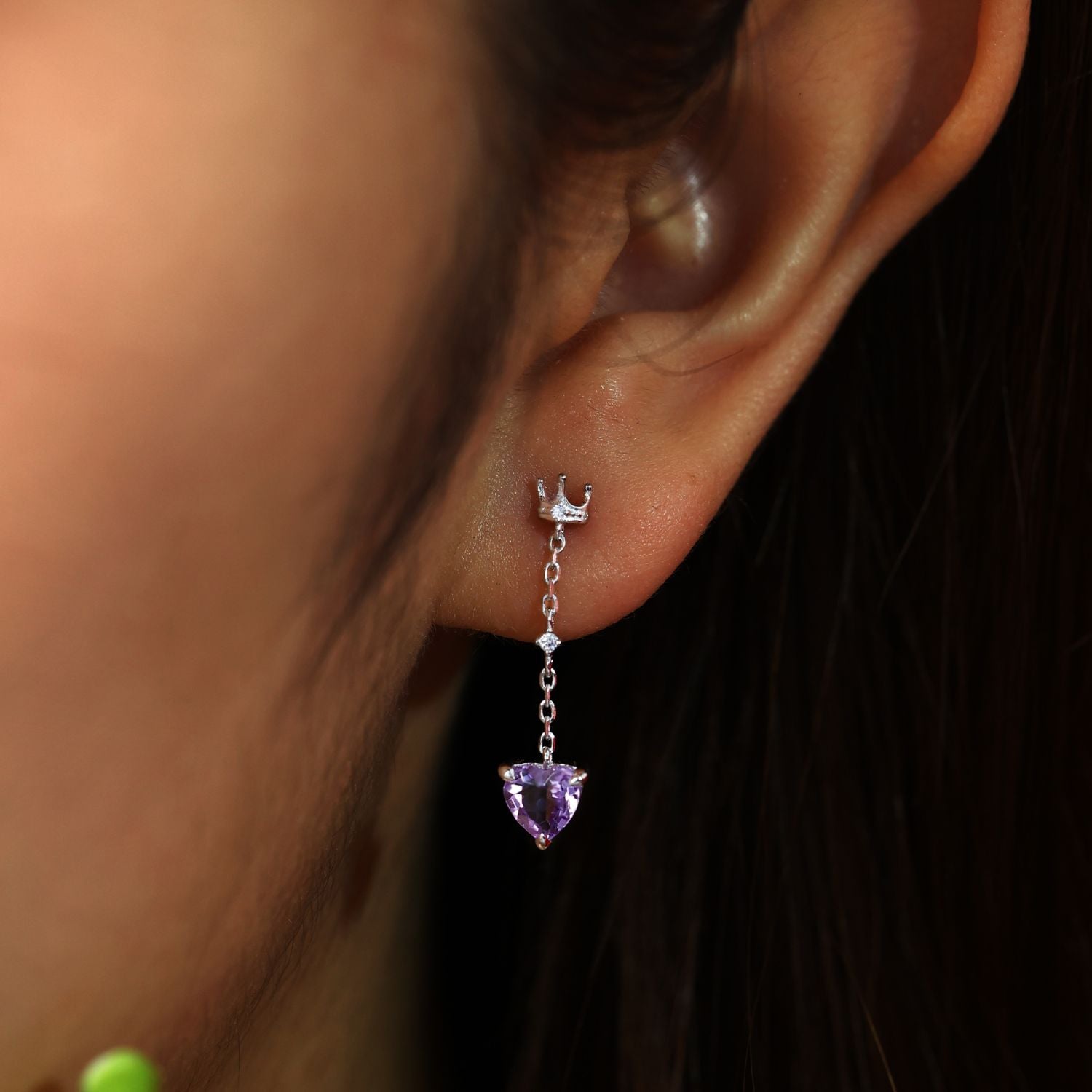 To protect her kingdom, the celestial guardians shaped her essence into a pair of earrings: radiant heart-shaped purple gems glowing with truth and intuition, crowned by a tiara to honor her wisdom. One gem rests gently at the ear, like a secret kept close. The other dangles delicately, suspended by a chain of light—as if echoing the queen’s promise to always lead with love, never force.