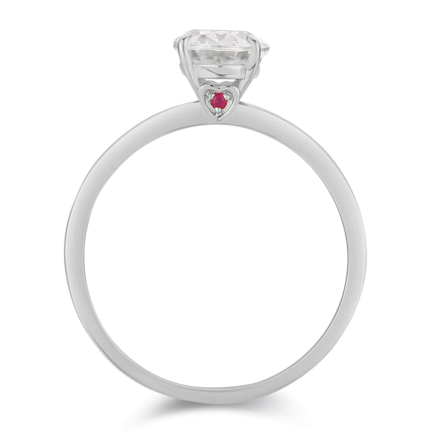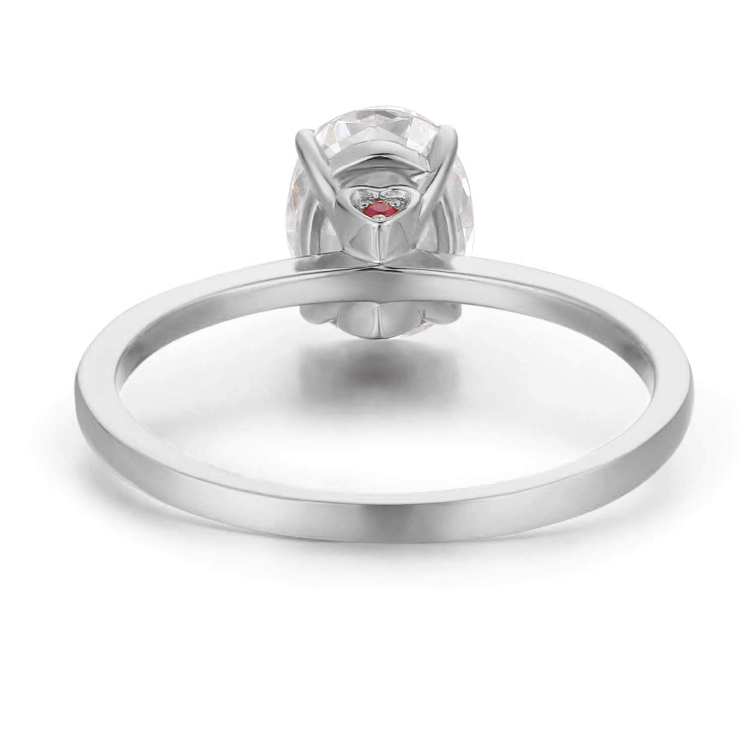 At the center of this elegant solitaire ring is a brilliant oval moissanite, known for its fiery sparkle. Nestled beneath the setting reveals its most intimate and romantic detail — a tiny heart-shaped bezel delicately cradling a peekaboo vibrant round red ruby.