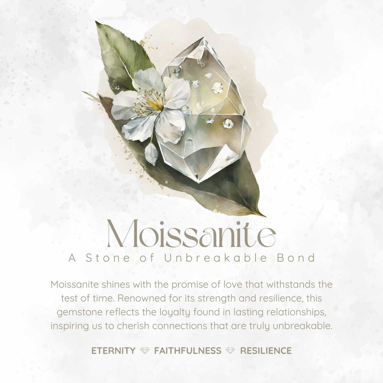 Powers: Moissanite awakens inner radiance. It is said to re-establish a connection to our true selves and with our higher spiritual realms. A brilliant gem that also aids in lowering stress levels, improving focus, and achieving mental clarity.