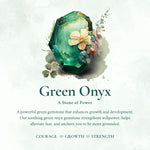 Powers: The Green Onyx meaning is physical healing. Green Onyx is associated with the heart chakra and the planet Mercury. It helps to develop your public speaking ability, creativeness, and also encourage you to express your feelings and thoughts. This stone creates a bridge between the upper three chakras and the lower three chakras
