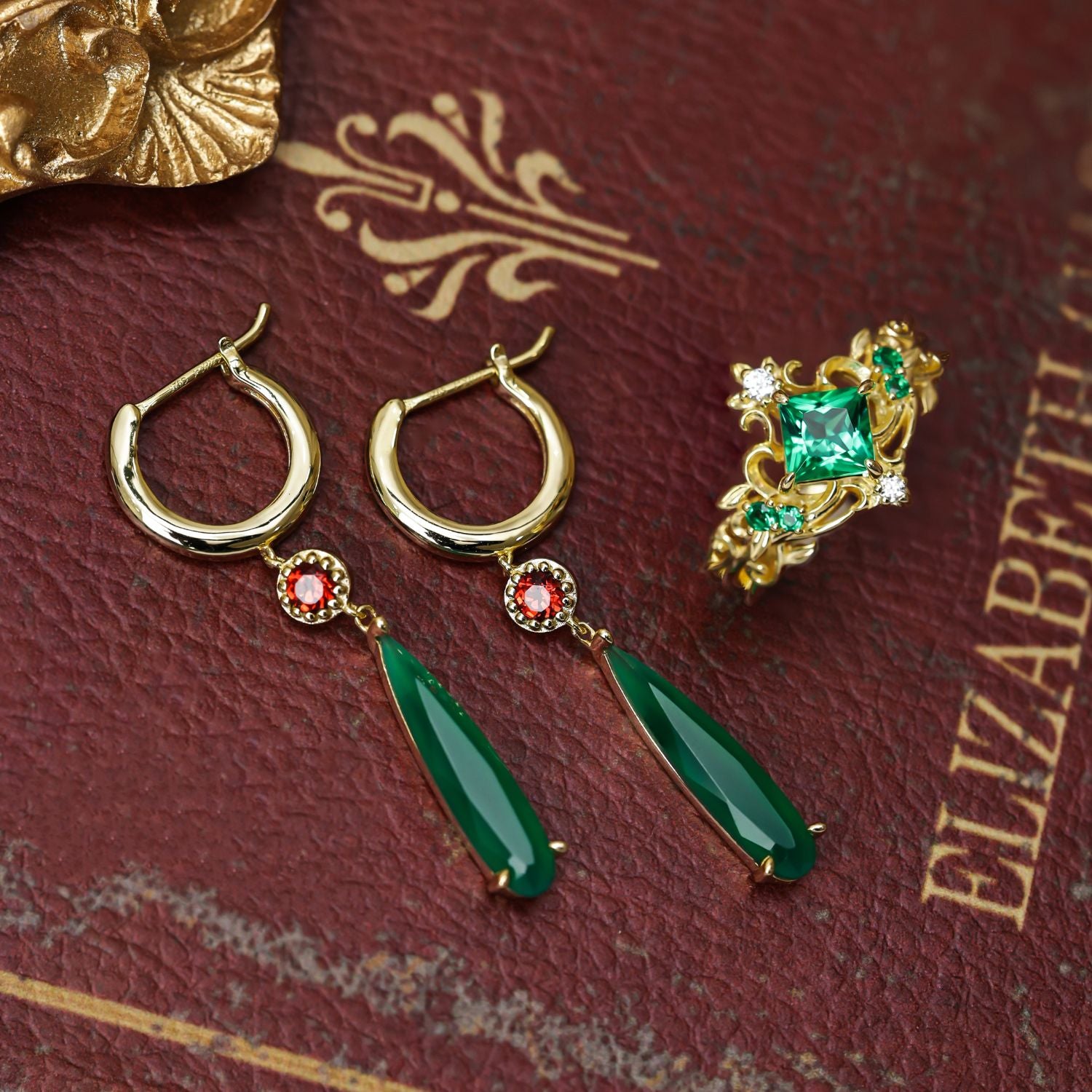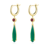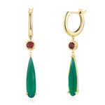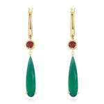 Crafted with a fiery round-cut red accent stone and a gracefully elongated faceted green onyx drop, these earrings are a nod to the iconic imagery of the film—flame and earth, heart and home. The vibrant green onyx evokes the lush, enchanted landscapes of Ingary, while the glowing red stone hints at the fire demon’s eternal spark.