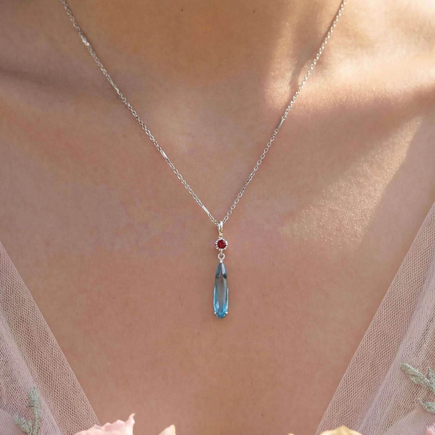 Crafted with a fiery round-cut red accent stone and a gracefully elongated faceted sky blue topaz pendant, this necklace is a nod to the iconic imagery of the film—flame and earth, heart and home. The serene glow of the sky blue stone evokes the open skies and boundless magic of Ingary, while the glowing red stone hints at the fire demon’s eternal spark.