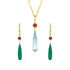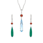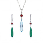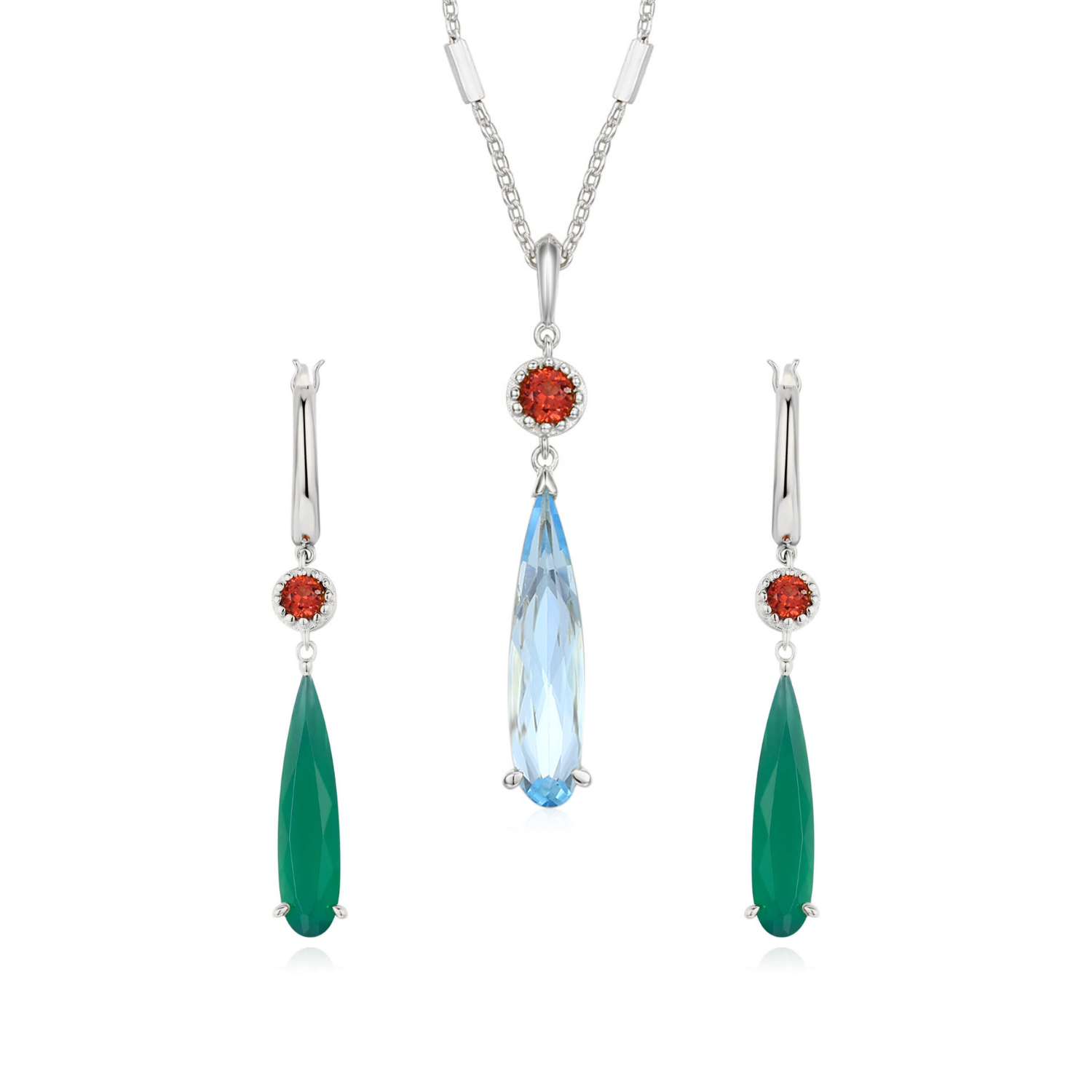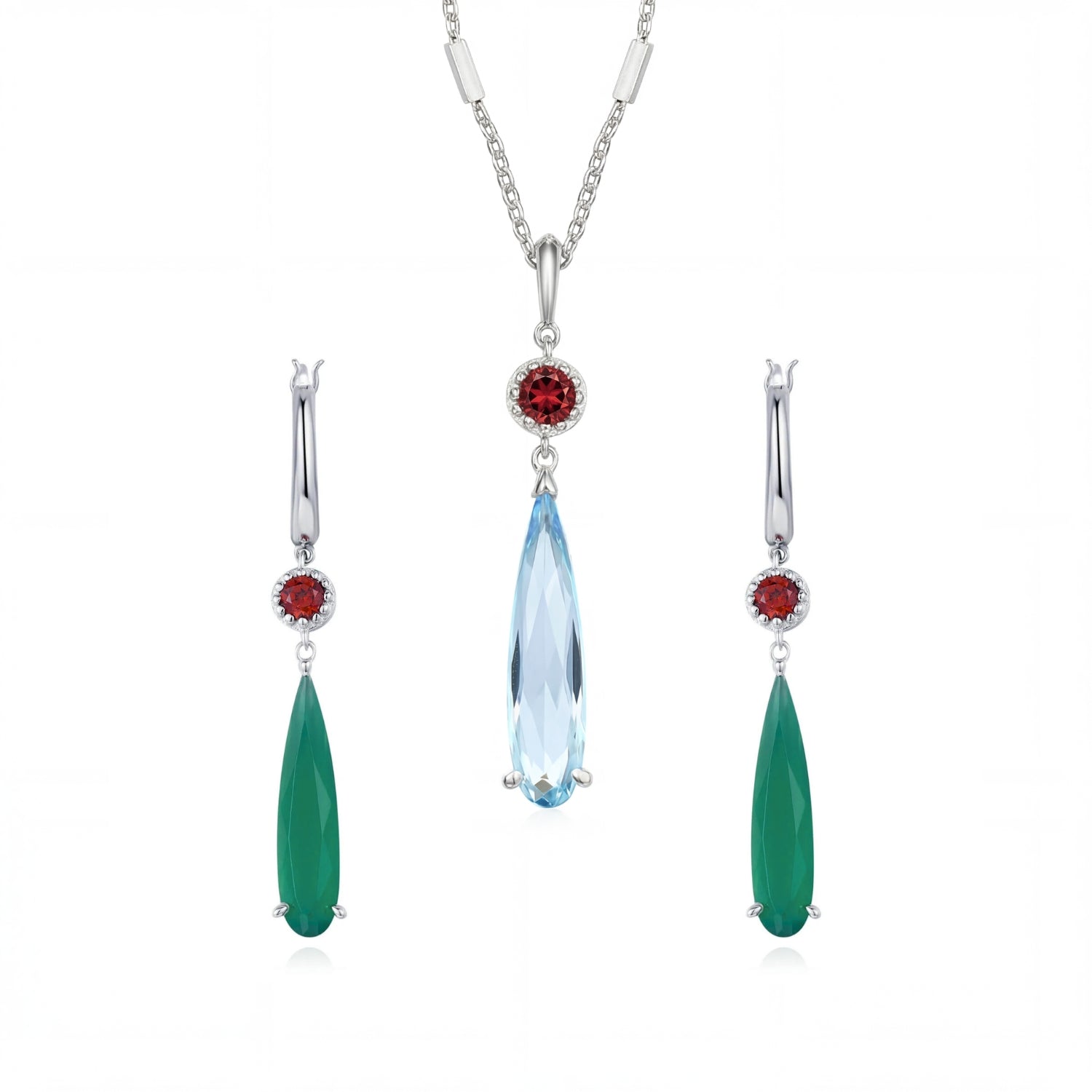 ✦ Gemstones: 17.5x4mm Sky Blue Topaz (necklace) and Green Onyx (earrings), 3mm round-cut natural Mozambique red garnet